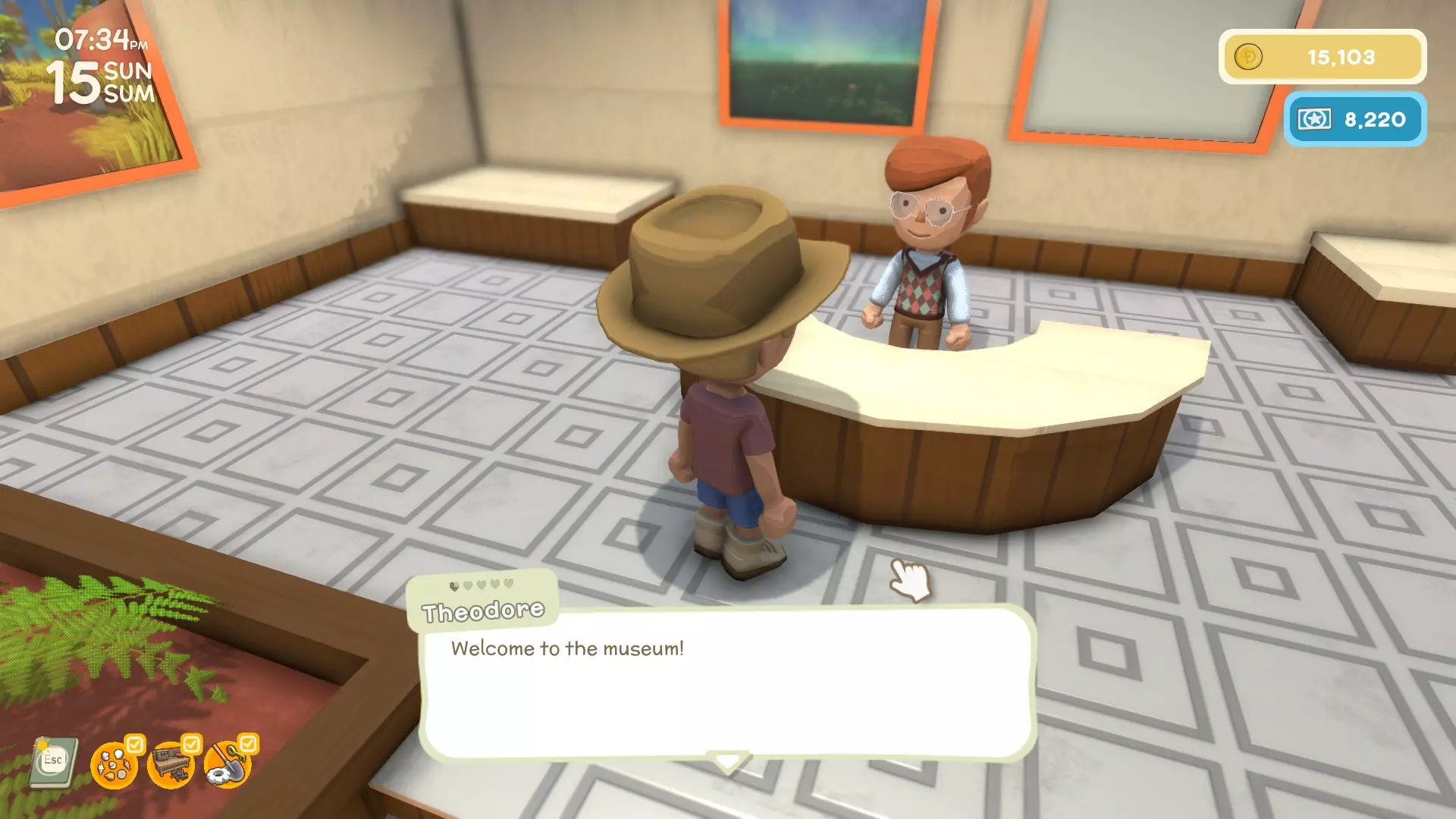 - 博物馆馆主 - 工作时间: - 向西奥多捐赠昆虫、小动物、鱼类等博物馆藏品 - 为西奥多处理个人事务(兴趣捐赠) - 你将从西奥多处获得相机 - 使用相机,你可以在博物馆内展示你拍摄的照片 - 讨厌:? - 喜欢:?