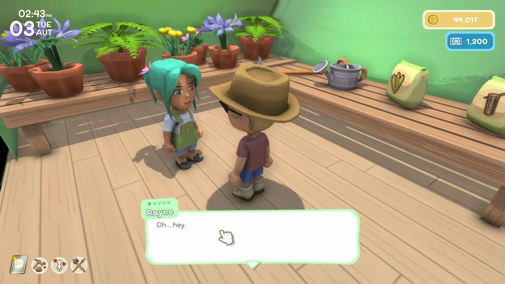- 雷恩温室的主人 - 营业时间:11点至14点,周五休息 - 向雷恩购买物品 - 为雷恩完成个人任务 - 购买锄头、 watering can、季节性种子 - 讨厌:香肠卷 - 喜欢:?