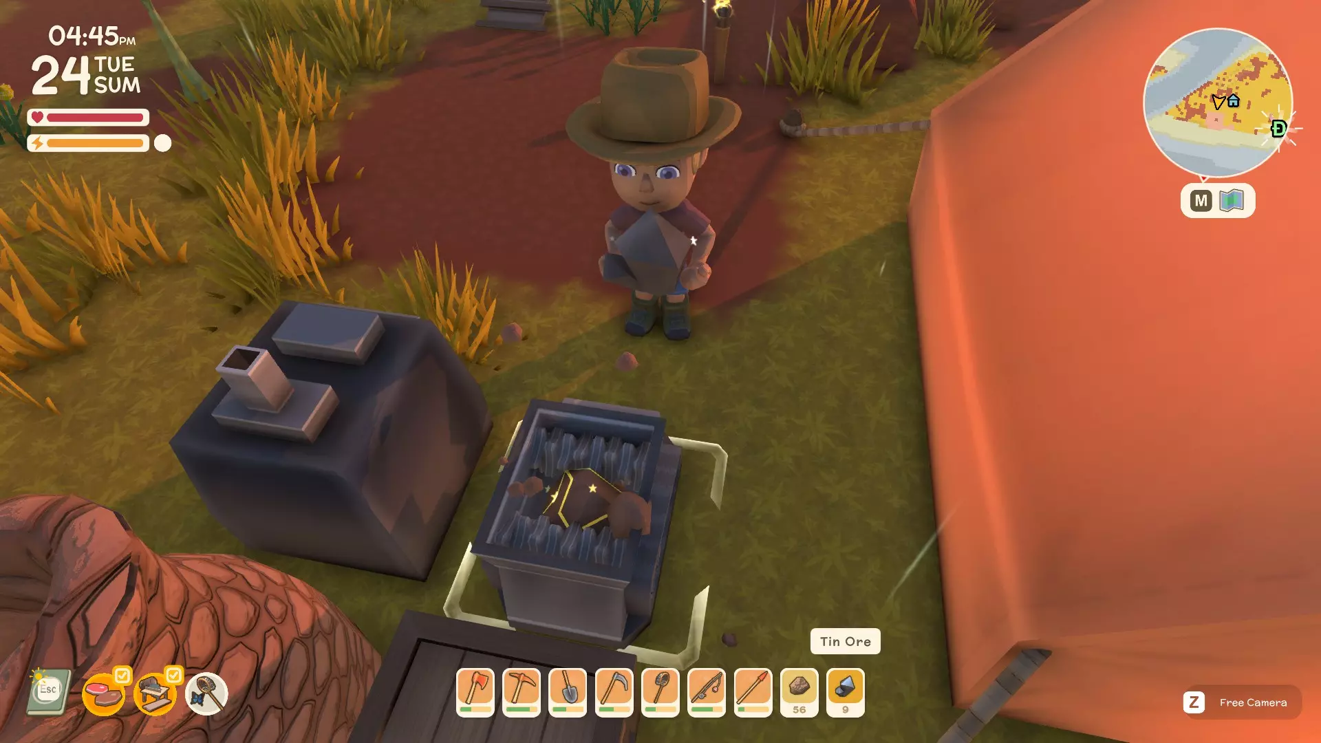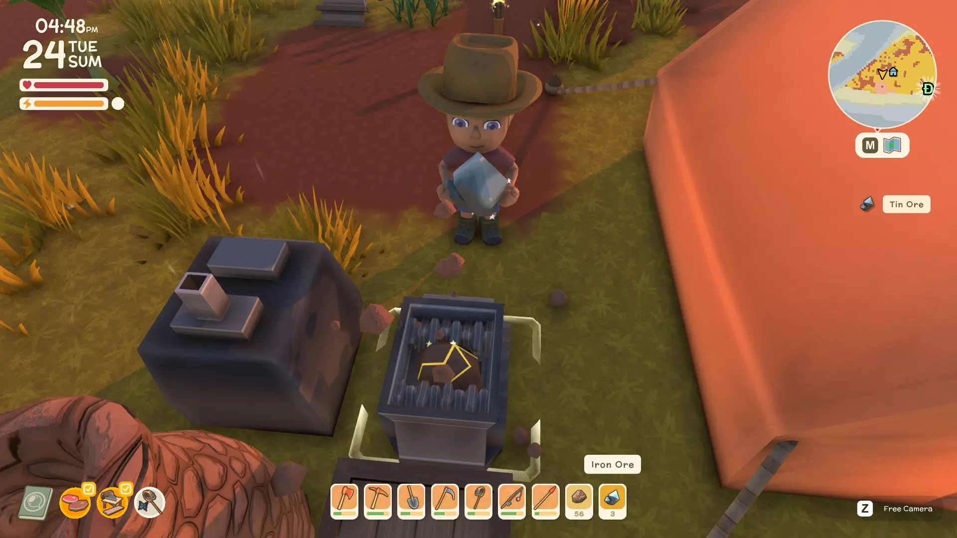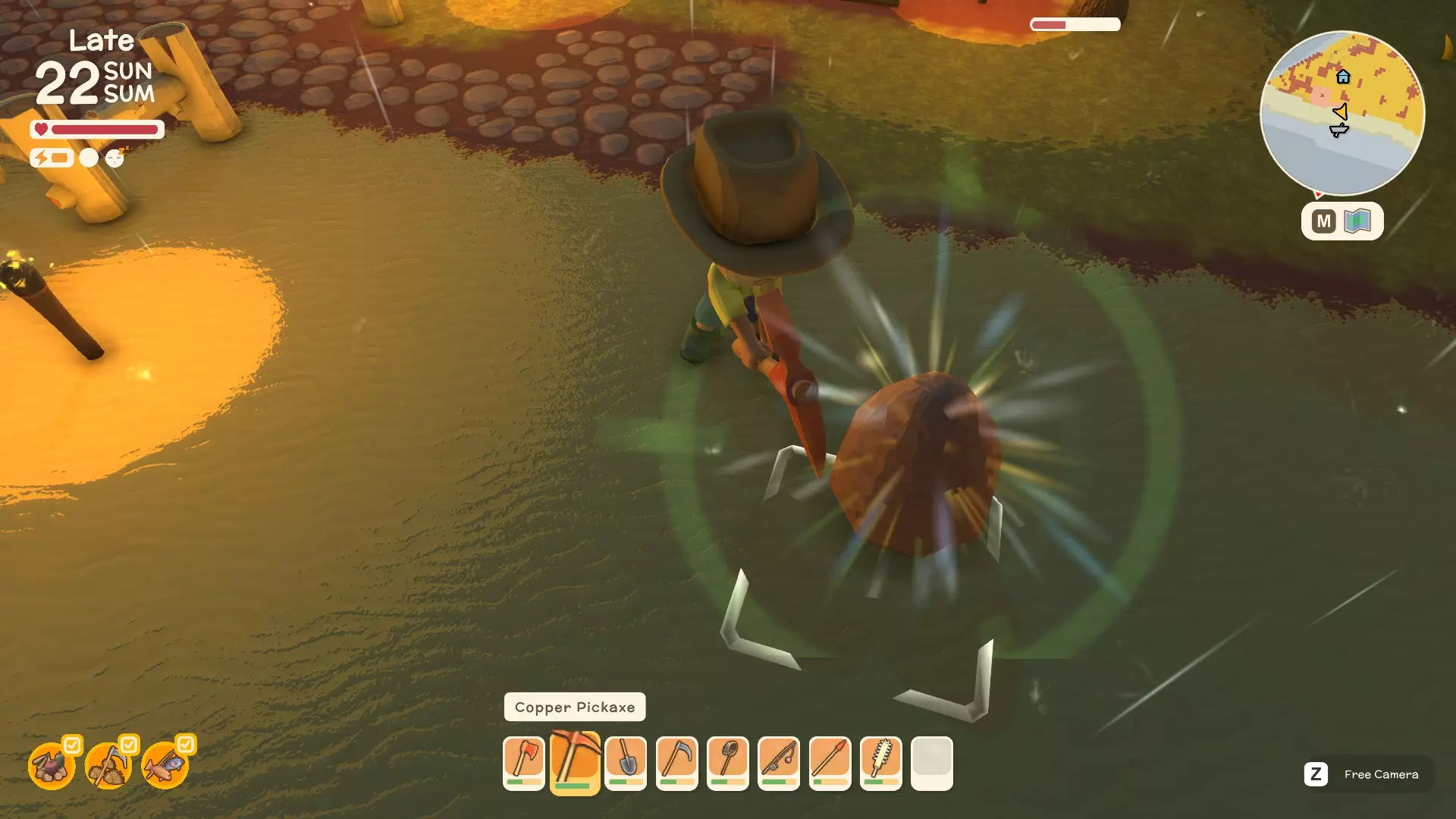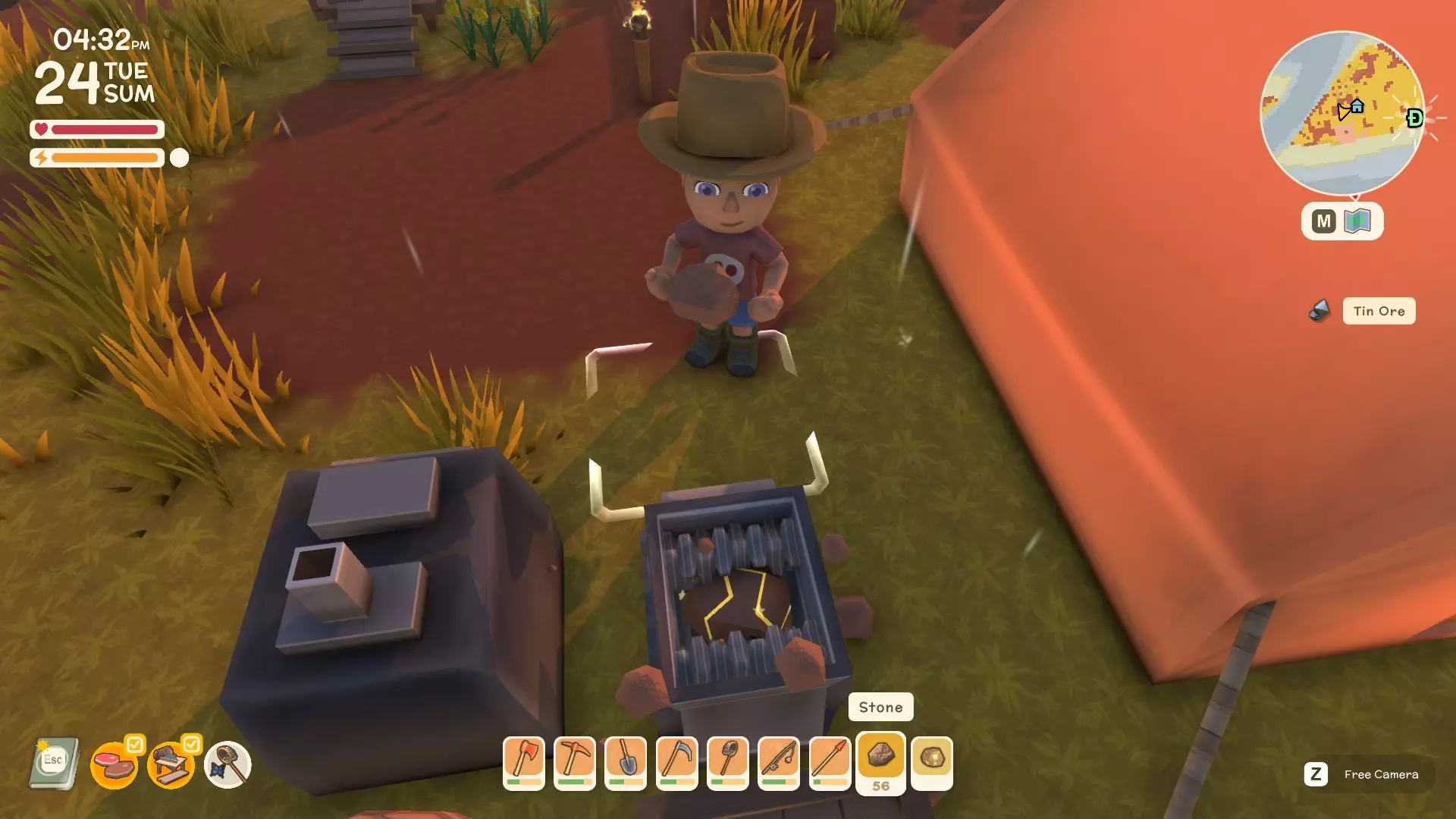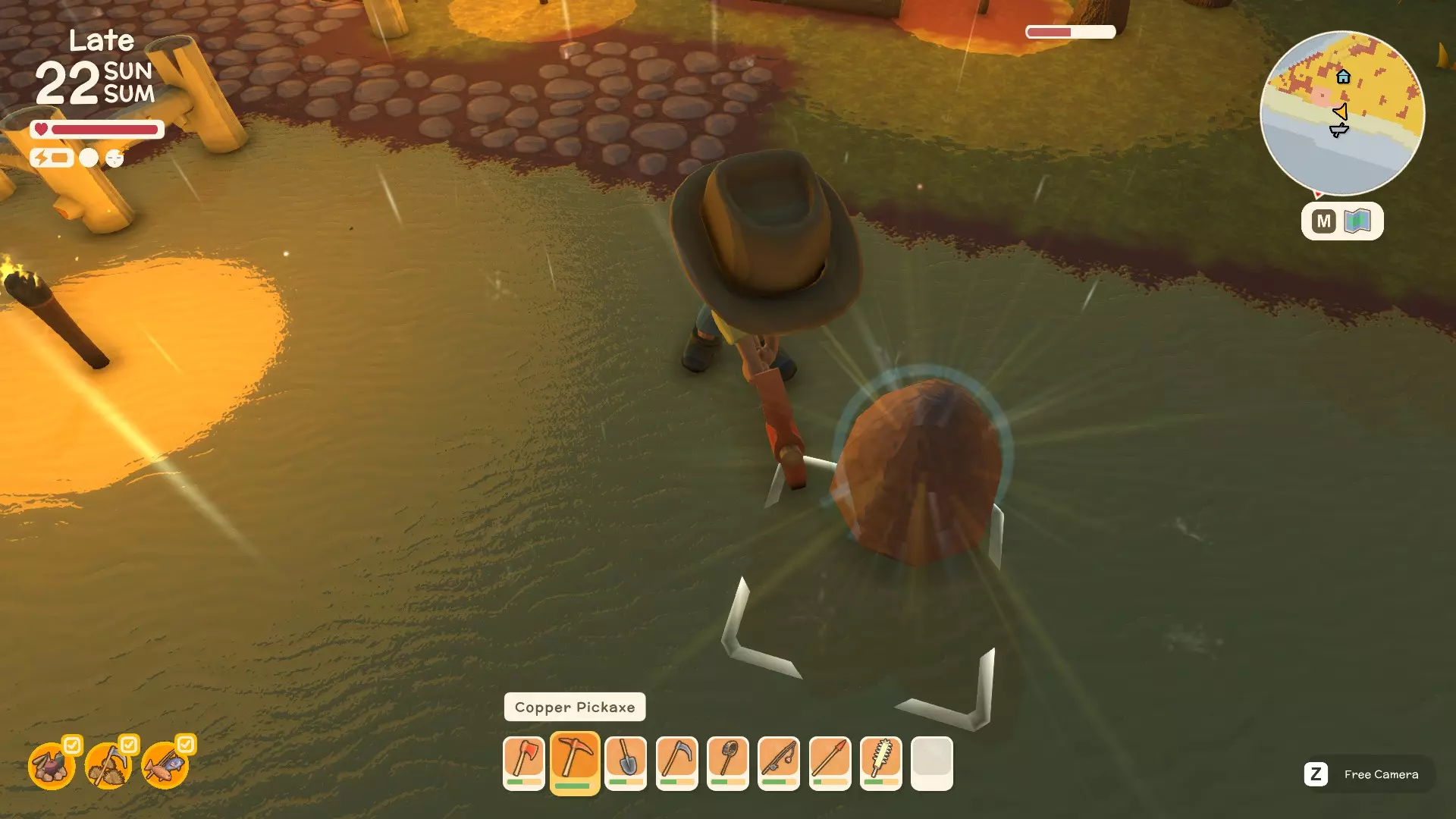 使用镐子采矿! 基础镐 - 可开采小型石头、铁矿、铜矿、石英晶体矿点以及木桶。 铜镐 - 可开采上述所有资源,还包括大型灰色岩石构造(这些可产出锡、铁、石头、铜、石英)。 用镐子获取骨头! 用捕虫网捕捉虫子!希望本指南对你有所帮助,祝你度过愉快的一天! 用长矛狩猎! 用镰刀收集草籽! 镰刀拥有3格宽的攻击范围,使用时要充分利用这一点,让每一次挥舞都发挥最大效果。这在清理你想要建造的区域并使其看起来整洁时非常有用。 例如:如果你挥舞100次,你是想击中100个目标,还是300个?所以要充分利用镰刀的耐久度。使用镰刀采集三齿稃丛! 制作三齿稃树脂! 在熔炉中熔炼矿石! 你可以在熔炉中熔炼(熔化)矿石(锡、铜等)以获得金属锭,但需要将矿石放入快捷栏,然后走到熔炉旁,逐个将矿石放入熔炉中。矿石需要一分钟左右才能熔炼成金属锭,因此请耐心等待。 对于其他矿石,你需要从约翰的商店购买升级后的熔炉才能进行熔炼。希望本指南对你有所帮助,祝你度过愉快的一天! 采矿头盔 - 全面解析!(更新中) 采矿头盔 - 电量有限,但能提供光源,让你在夜间看得更清楚。注意合理使用灯光,避免电量浪费。