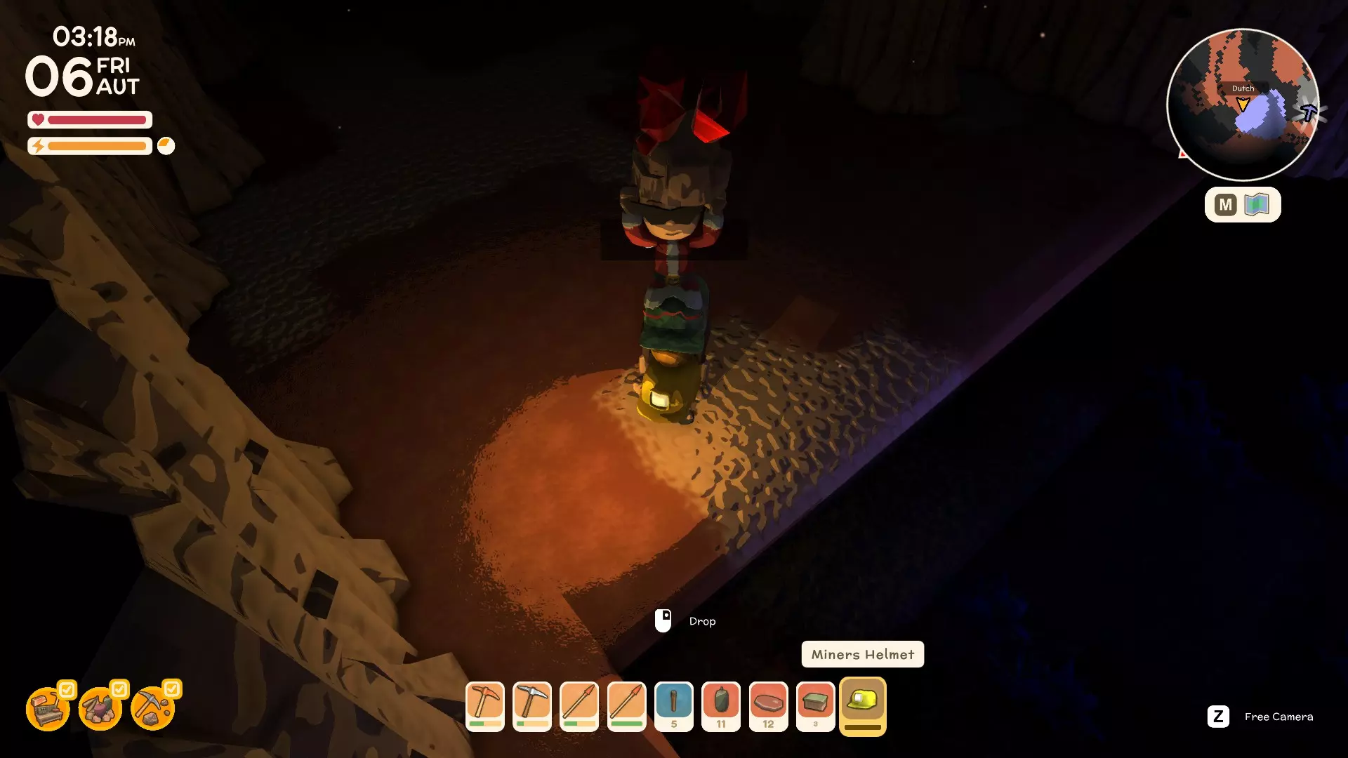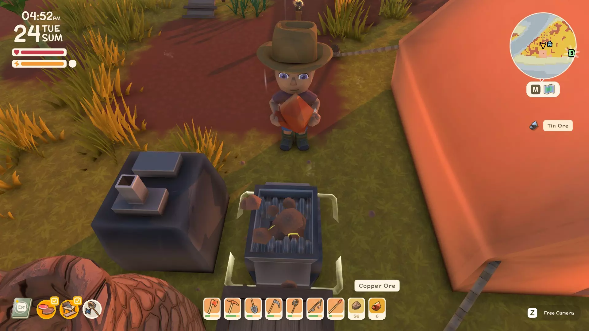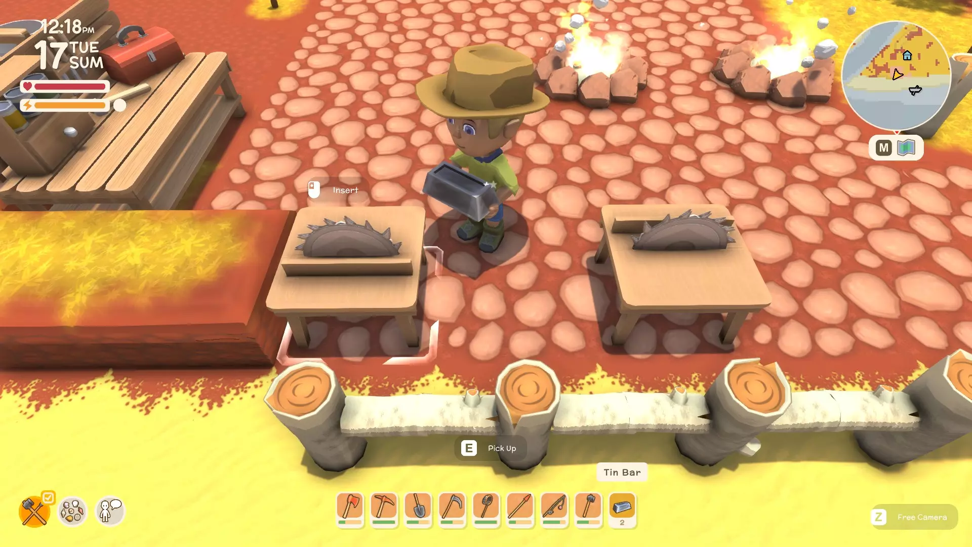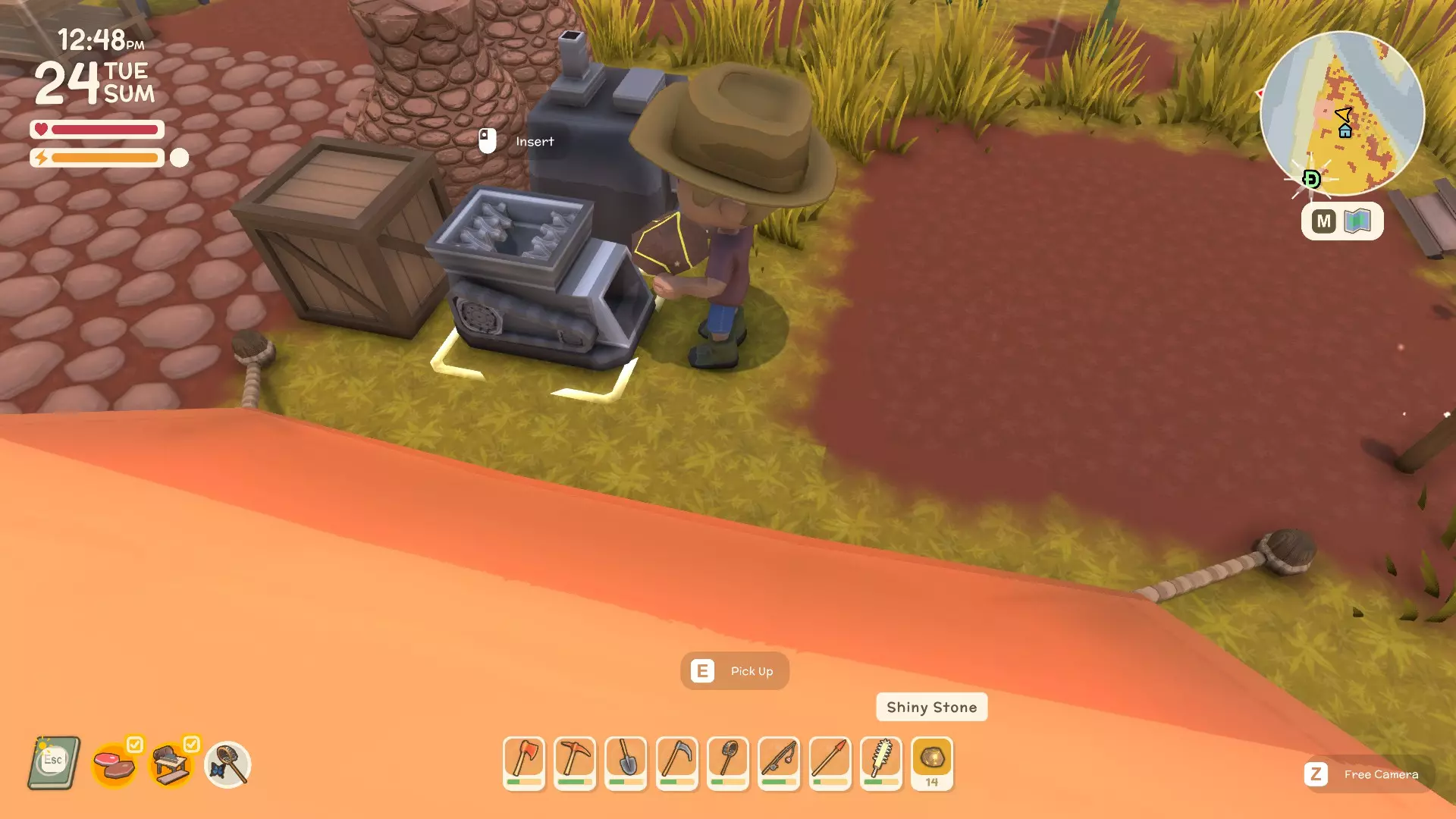 使用镐子采矿! 基础镐 - 可开采小型石头、铁矿、铜矿、石英晶体矿点以及木桶。 铜镐 - 可开采上述所有资源,还包括大型灰色岩石构造(这些可产出锡、铁、石头、铜、石英)。 用镐子获取骨头! 用捕虫网捕捉虫子!希望本指南对你有所帮助,祝你度过愉快的一天! 用长矛狩猎! 用镰刀收集草籽! 镰刀拥有3格宽的攻击范围,使用时要充分利用这一点,让每一次挥舞都发挥最大效果。这在清理你想要建造的区域并使其看起来整洁时非常有用。 例如:如果你挥舞100次,你是想击中100个目标,还是300个?所以要充分利用镰刀的耐久度。使用镰刀采集三齿稃丛! 制作三齿稃树脂! 在熔炉中熔炼矿石! 你可以在熔炉中熔炼(熔化)矿石(锡、铜等)以获得金属锭,但需要将矿石放入快捷栏,然后走到熔炉旁,逐个将矿石放入熔炉中。矿石需要一分钟左右才能熔炼成金属锭,因此请耐心等待。 对于其他矿石,你需要从约翰的商店购买升级后的熔炉才能进行熔炼。希望本指南对你有所帮助,祝你度过愉快的一天! 采矿头盔 - 全面解析!(更新中) 采矿头盔 - 电量有限,但能提供光源,让你在夜间看得更清楚。注意合理使用灯光,避免电量浪费。