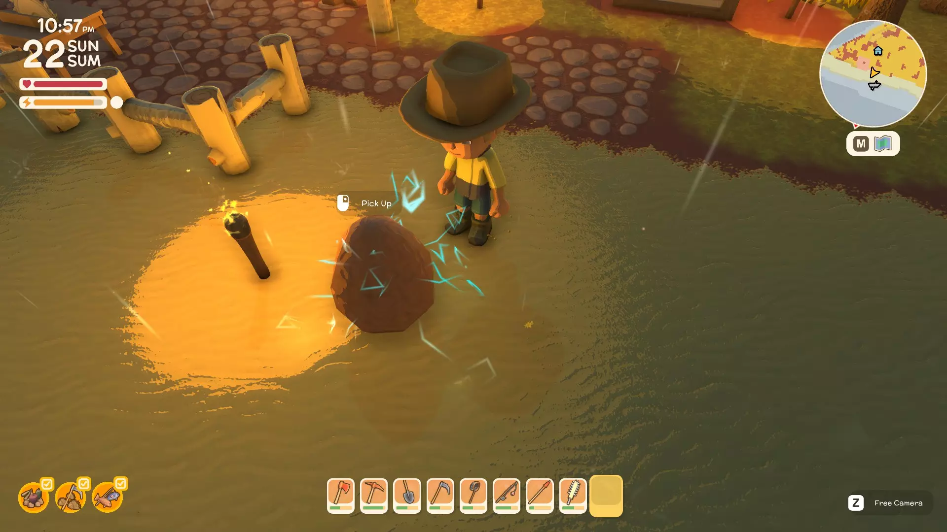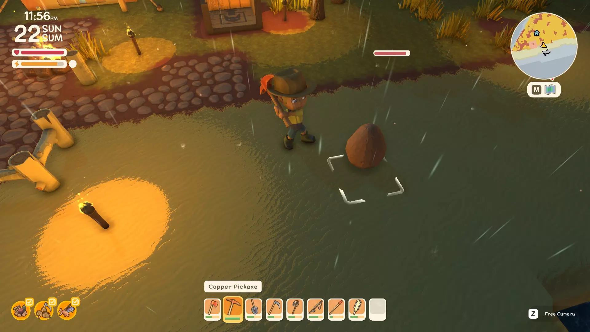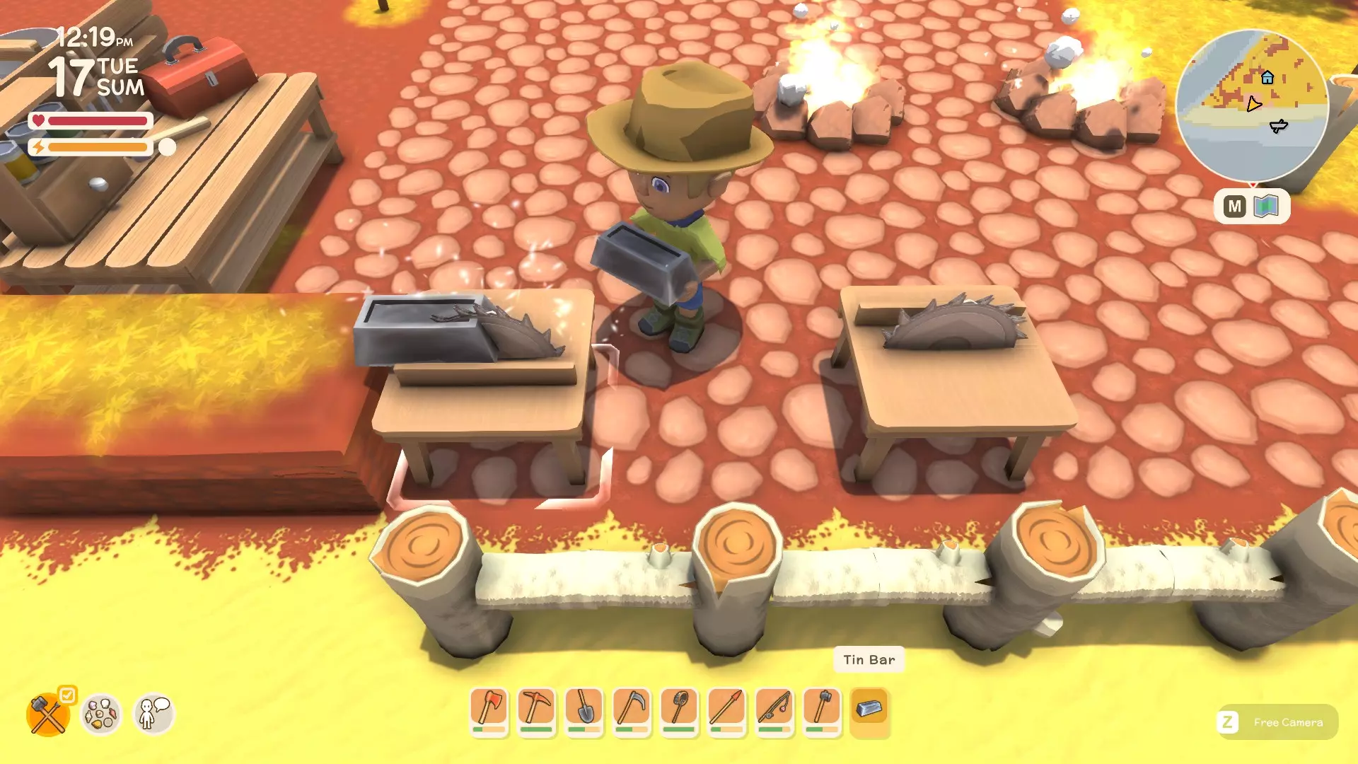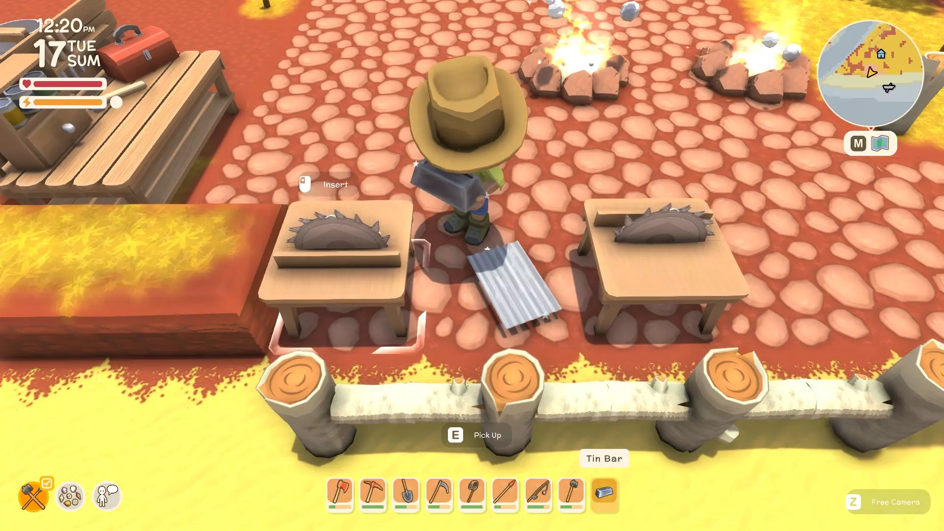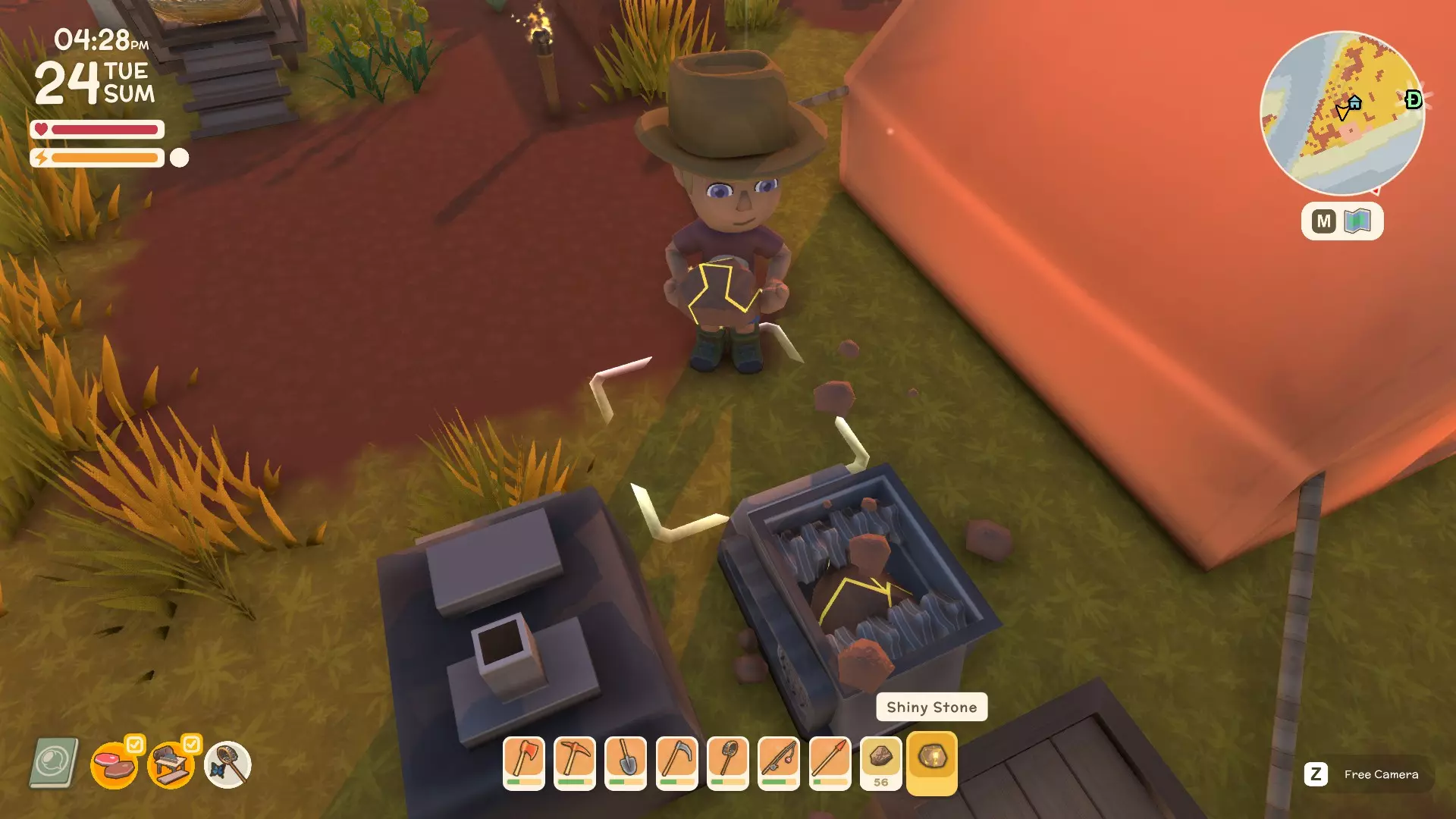 使用镐子采矿! 基础镐 - 可开采小型石头、铁矿、铜矿、石英晶体矿点以及木桶。 铜镐 - 可开采上述所有资源,还包括大型灰色岩石构造(这些可产出锡、铁、石头、铜、石英)。 用镐子获取骨头! 用捕虫网捕捉虫子!希望本指南对你有所帮助,祝你度过愉快的一天! 用长矛狩猎! 用镰刀收集草籽! 镰刀拥有3格宽的攻击范围,使用时要充分利用这一点,让每一次挥舞都发挥最大效果。这在清理你想要建造的区域并使其看起来整洁时非常有用。 例如:如果你挥舞100次,你是想击中100个目标,还是300个?所以要充分利用镰刀的耐久度。使用镰刀采集三齿稃丛! 制作三齿稃树脂! 在熔炉中熔炼矿石! 你可以在熔炉中熔炼(熔化)矿石(锡、铜等)以获得金属锭,但需要将矿石放入快捷栏,然后走到熔炉旁,逐个将矿石放入熔炉中。矿石需要一分钟左右才能熔炼成金属锭,因此请耐心等待。 对于其他矿石,你需要从约翰的商店购买升级后的熔炉才能进行熔炼。希望本指南对你有所帮助,祝你度过愉快的一天! 采矿头盔 - 全面解析!(更新中) 采矿头盔 - 电量有限,但能提供光源,让你在夜间看得更清楚。注意合理使用灯光,避免电量浪费。