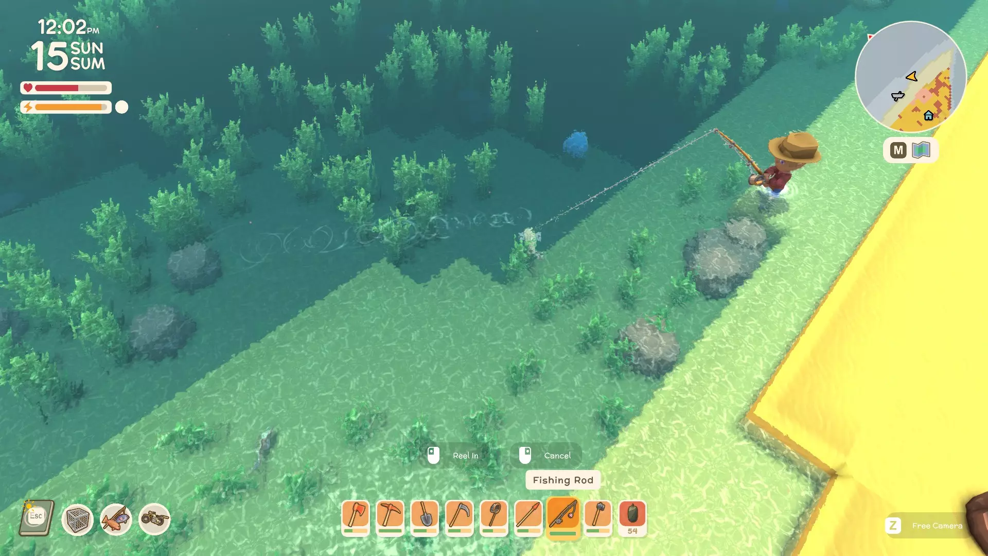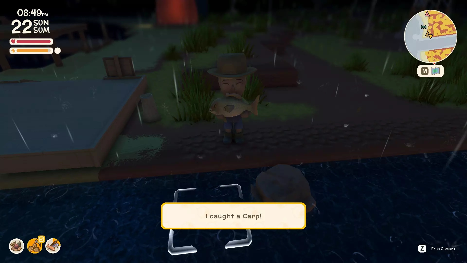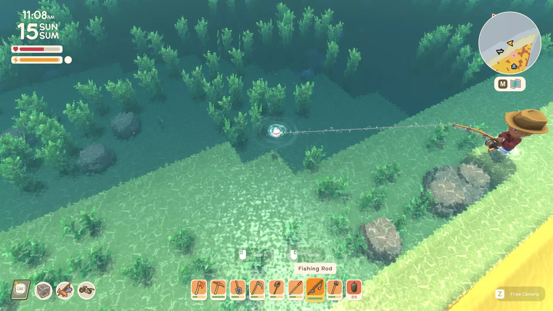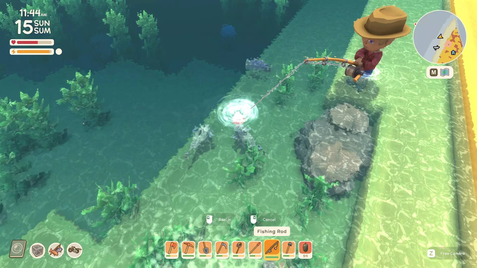 接下来你需要坐下等待,通常如果你把浮漂抛在鱼附近的话,等待时间不会太长。你要等鱼开始咬线(每次咬钩时你会看到浮漂轻微抖动)。一旦鱼把浮漂拖入水下(会溅起一点水花),你就点击一次按钮来上钩。