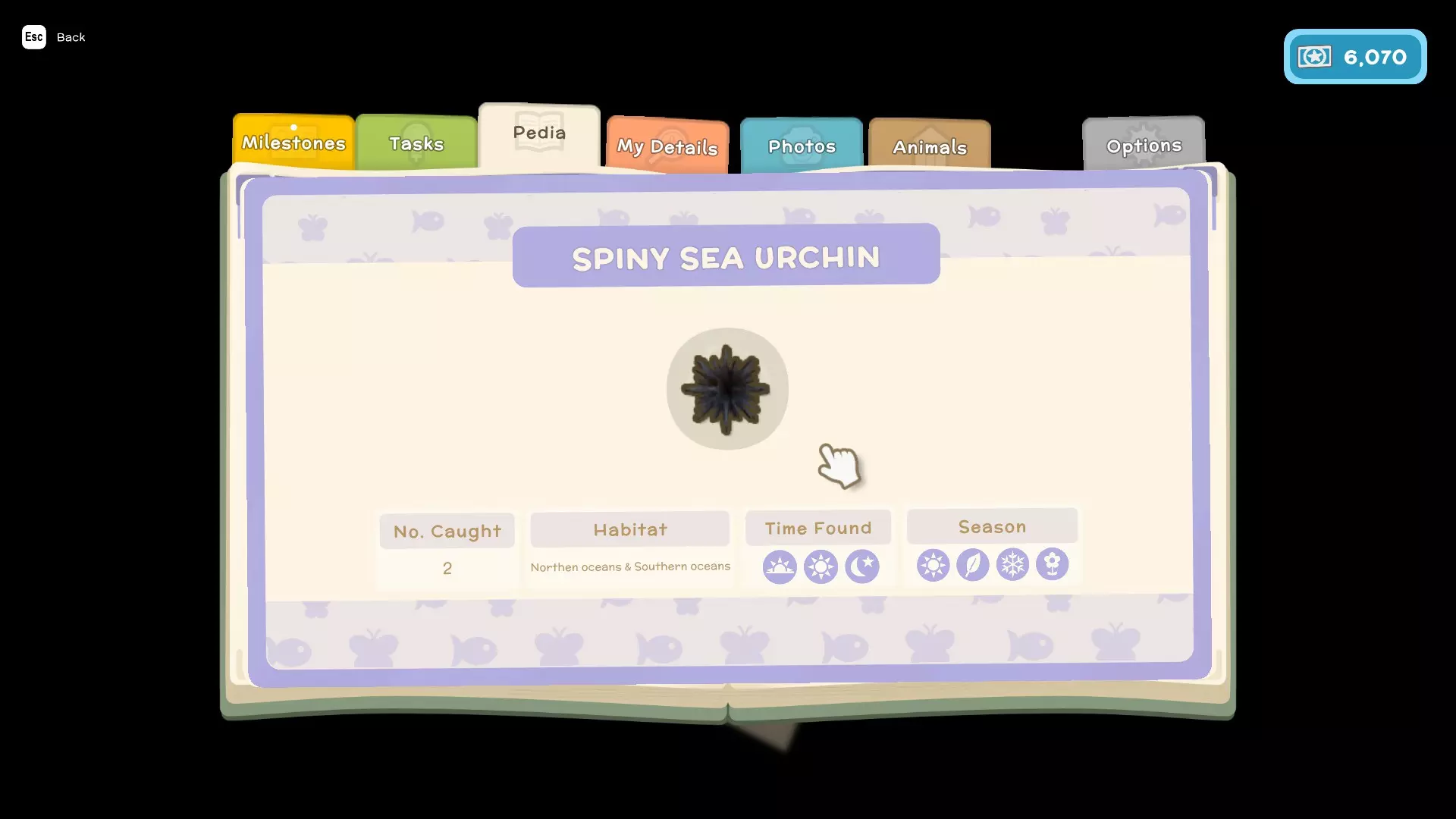 生物列表----------19/19(已完成) 海湾虫 - 4,540美元 饼干海星 - 1,200美元 黑海参 - 12,540美元(在海底拾取) 蓝贻贝 - 799美元 蓝海蛞蝓 - 12,540美元 垫海星 - 2,540美元 十一腕海星 - 8,540美元 淡水贻贝 - 800美元 淡水虾 - 1,540美元 内陆蟹 - 740美元 大虾 - 3,540美元 泥蟹 - 4,540美元 粉红海胆 - 1,540美元 紫斑蟹 - 440美元 紫海胆 - 8,040美元 刺海胆 - 640美元 虎虾 - 1,694美元 白螯虾 - 980美元 螯虾 - 1,899美元