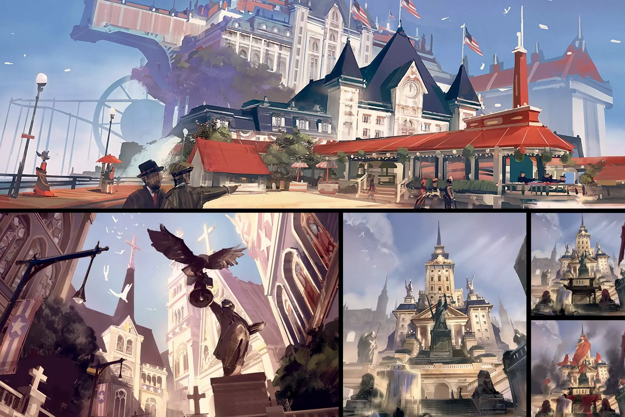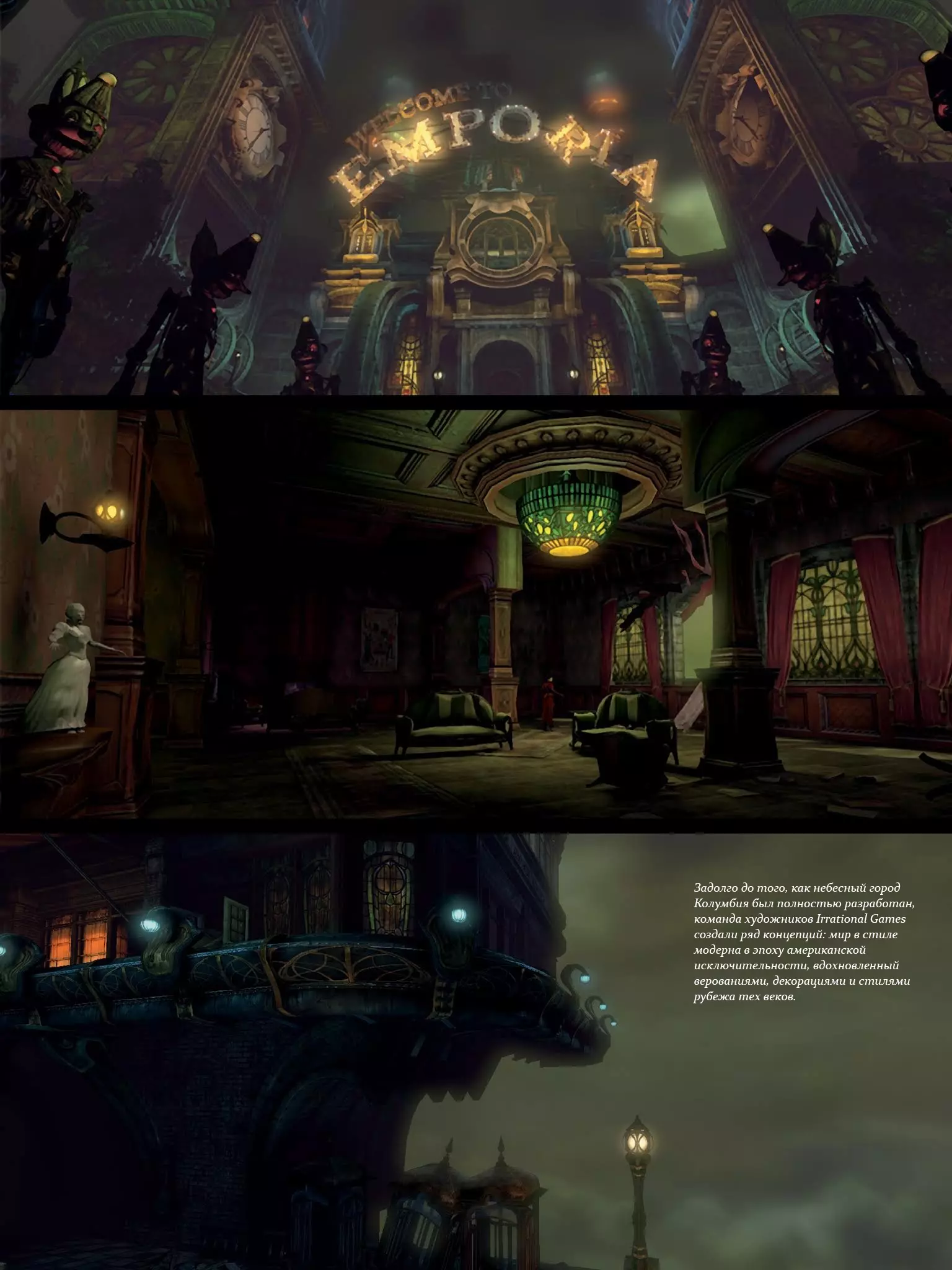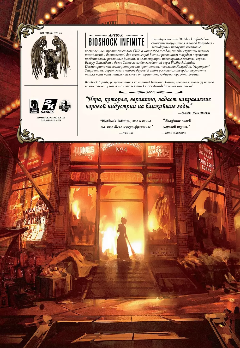 《生化奇兵:无限》世界艺术设定集将帮助你沉浸在哥伦比亚市的世界中——这座由美国政府在19世纪末建造的传奇浮空城市,是世界科技成就的巅峰! 简介 这是官方艺术设定集,专门介绍近年来最具传奇色彩的游戏之一。《生化奇兵:无限》不只是一款关于前往空中城市哥伦比亚、旨在解救被囚禁于塔楼中、拥有独自毁灭整个世界能力的女孩的游戏。《生化奇兵:无限艺术设定集》是一本制作及概念艺术书籍,于2013年2月27日,也就是《生化奇兵:无限》发售后推出。该书由Dark Horse出版社以精装形式出版,目前售价为39.99美元。祝您观看愉快!