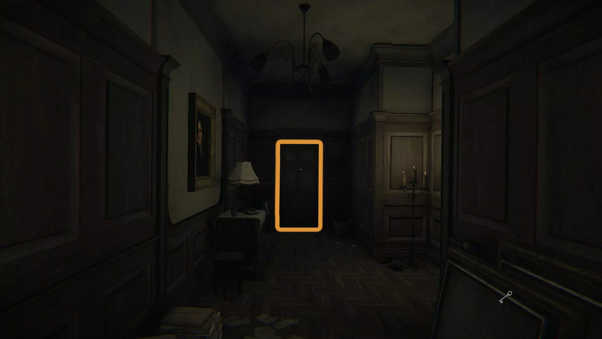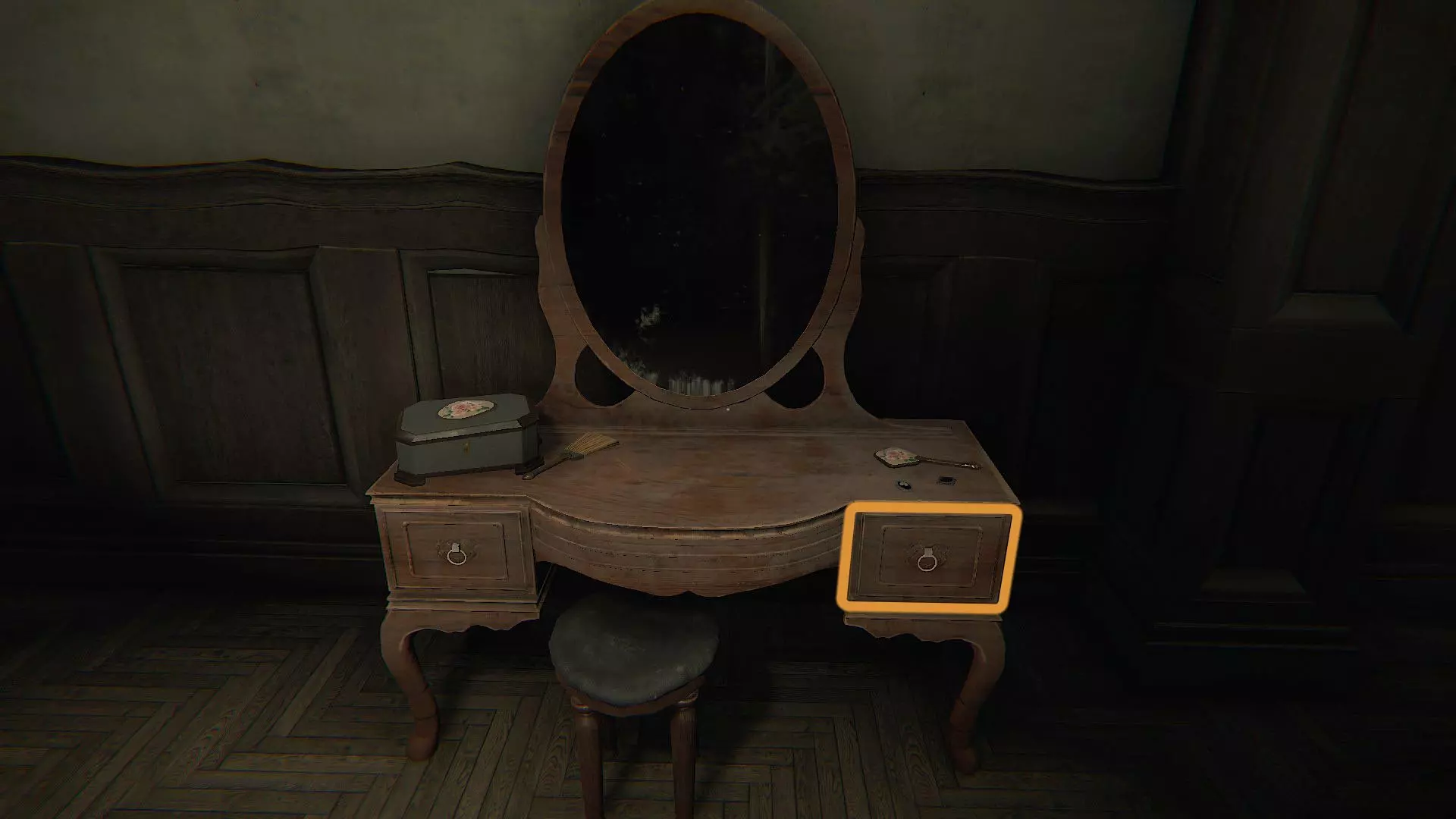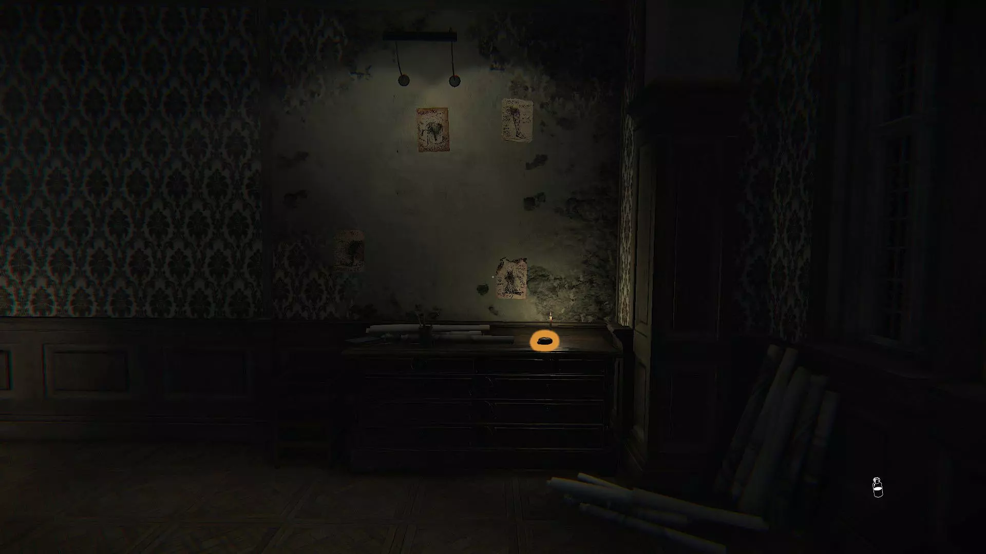 回忆#06:画家与妻子的结婚照 在你刚拿到信件的那个卧室里,查看门边书桌的抽屉(如图所示位置),在那里可以找到照片。 文字#06:画家的手杖 一旦你能离开被锁住的房间,就出去沿着颜料痕迹走向你左边的画作,就像第一张图那样。一直看着画作,直到手杖出现,然后触摸它。