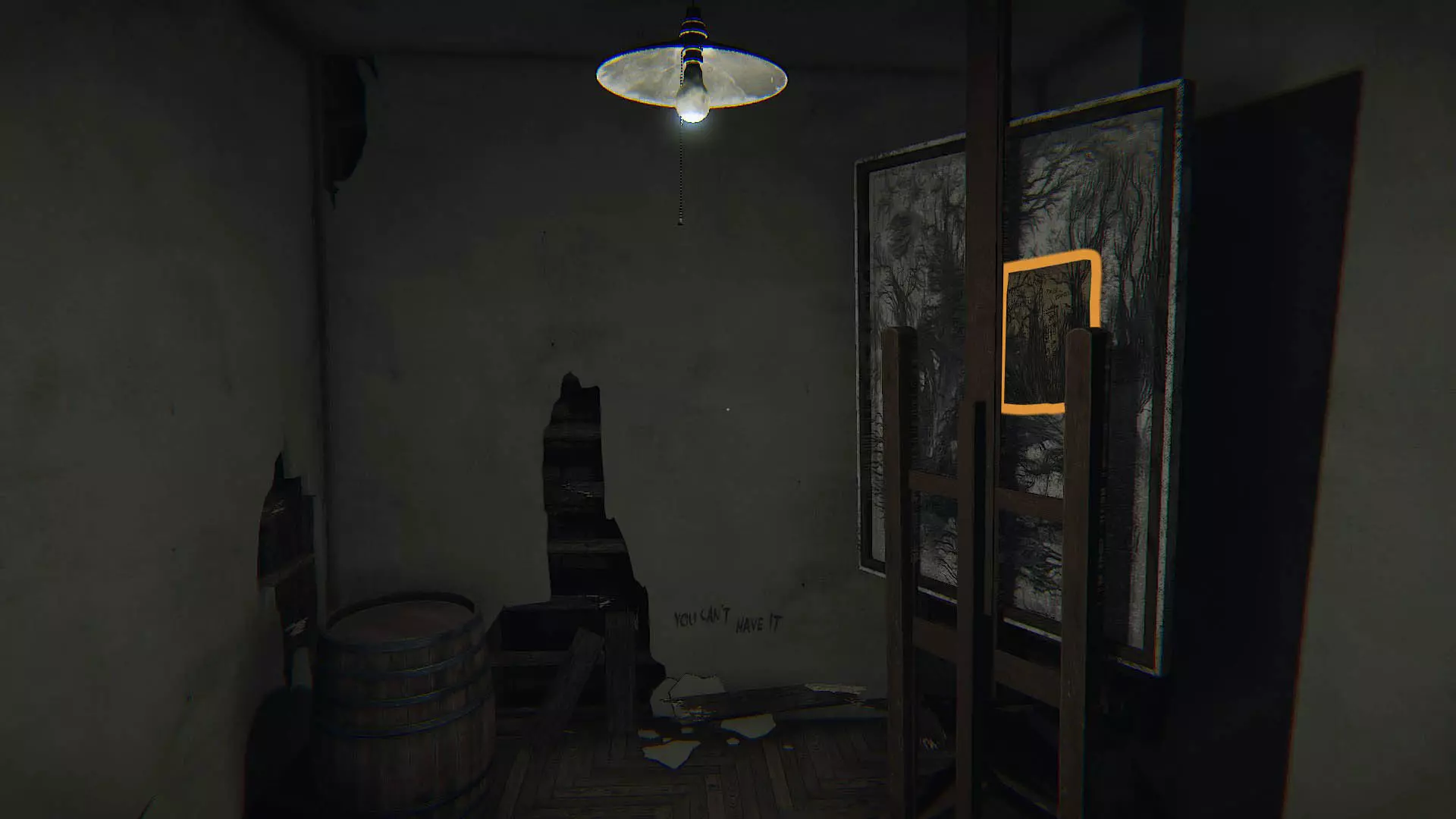 画作#09:寄生生物正在吸食我 穿过天花板上有管道、灯泡闪烁的走廊。你会到达前两张图片中看到的位置,必须打开那个巨大物体(一个盖着布的椅子放在木箱上)后面的带插销的门。进入后,就在你的右边有一个小抽屉,打开它并拿起画作。