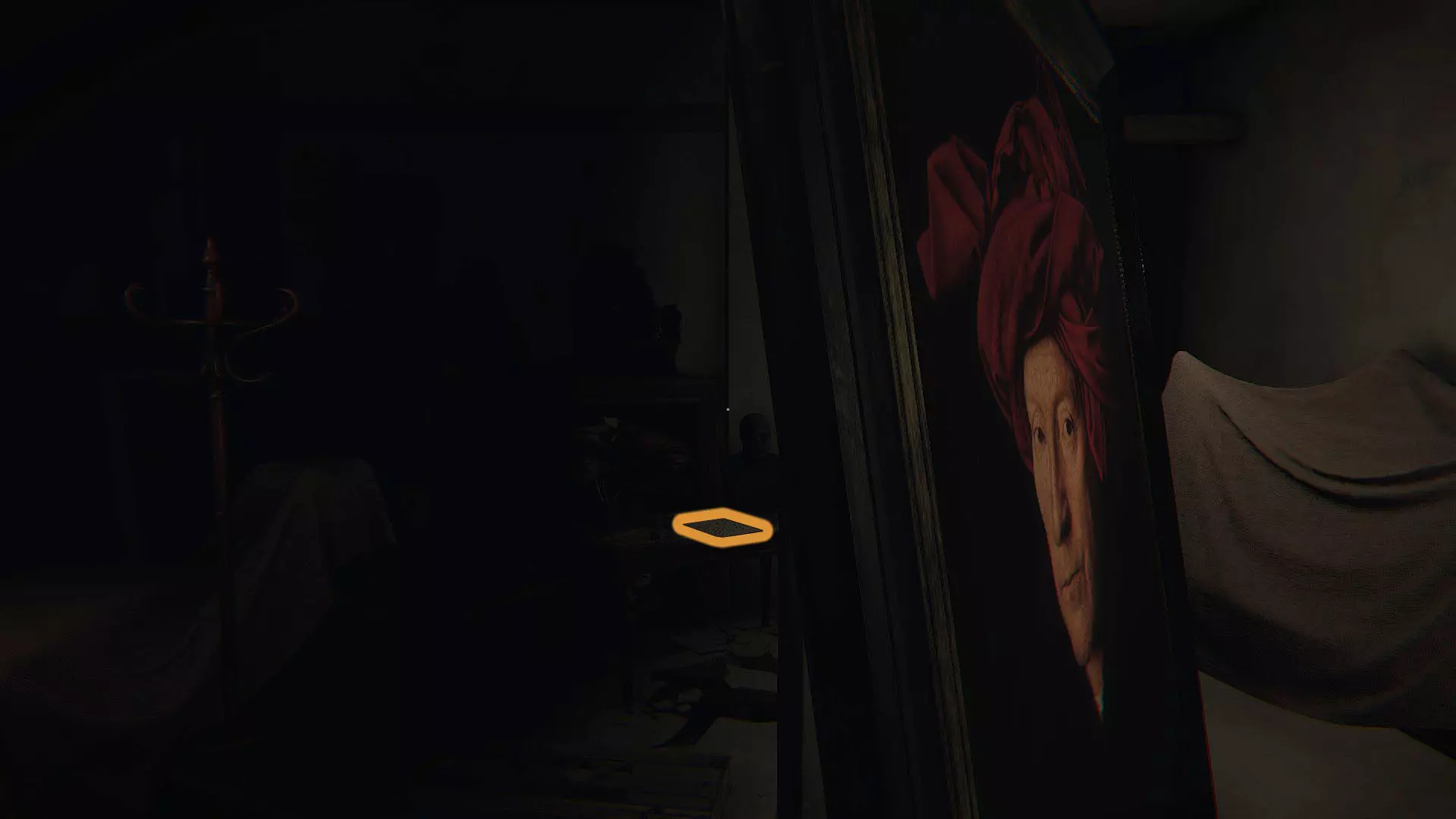 回忆#02:妻子写给未出世宝宝的信 在你身后突然出现戴头巾男人的画像并融化后,你可以像第二张图那样走到画像后面,阅读床头柜上的信。
