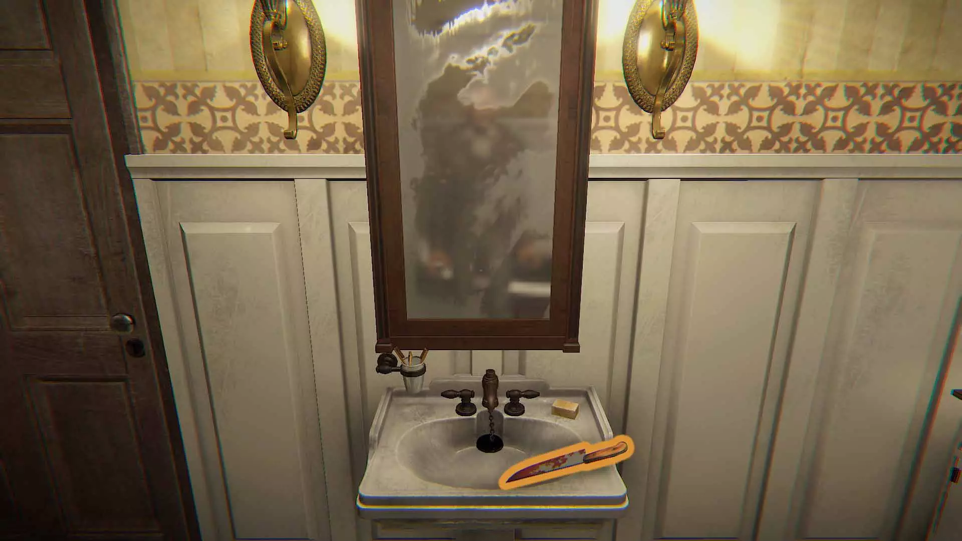词语#26:沾满鲜血的刀 打开下一扇门,你就会进入影像浴室。洗手台上会有那把刀。