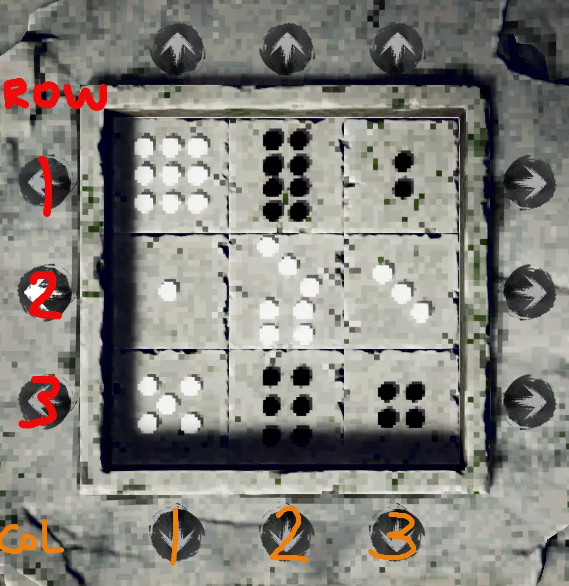 现在,我们可以用7步解决这个问题。 我在图上用红色标注了行,用橙色标注了列来帮助理解。从这个初始状态开始,我们需要: 1. 将第1行向左旋转一次 2. 将第1列向上旋转一次 3. 将第3行向左旋转一次 4. 将第3列向下旋转一次 5. 将第3行向左旋转一次 6. 将第3列向下旋转一次 7. 将第2行向右旋转一次 这样应该能让你快速得到解决方案,省去不少麻烦!