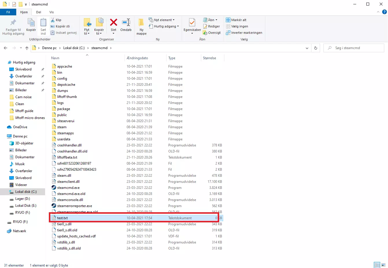 步骤4:创建文本文档 - 在“C: SteamCMD”文件夹中创建一个文本文档,名称可以随意取。 本指南中,我们将其命名为“test”。 (路径应如下所示:C: SteamCMD test.txt) 创建文本文档的方法:在steamcmd文件夹内右键点击->新建->文本文档