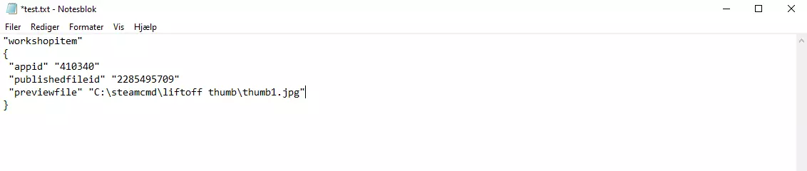 步骤5:编辑文本文档 - 打开你刚刚创建的“test”文本文档,并将以下内容复制粘贴到文档中: "workshopitem" { "appid" "410340" "publishedfileid" "2285495709" "previewfile" "C: steamcmd liftoff thumb thumb1.jpg" } - Appid可以在任何游戏商店网站的网址栏中找到。 对于【Liftoff】,其Appid应为410340。