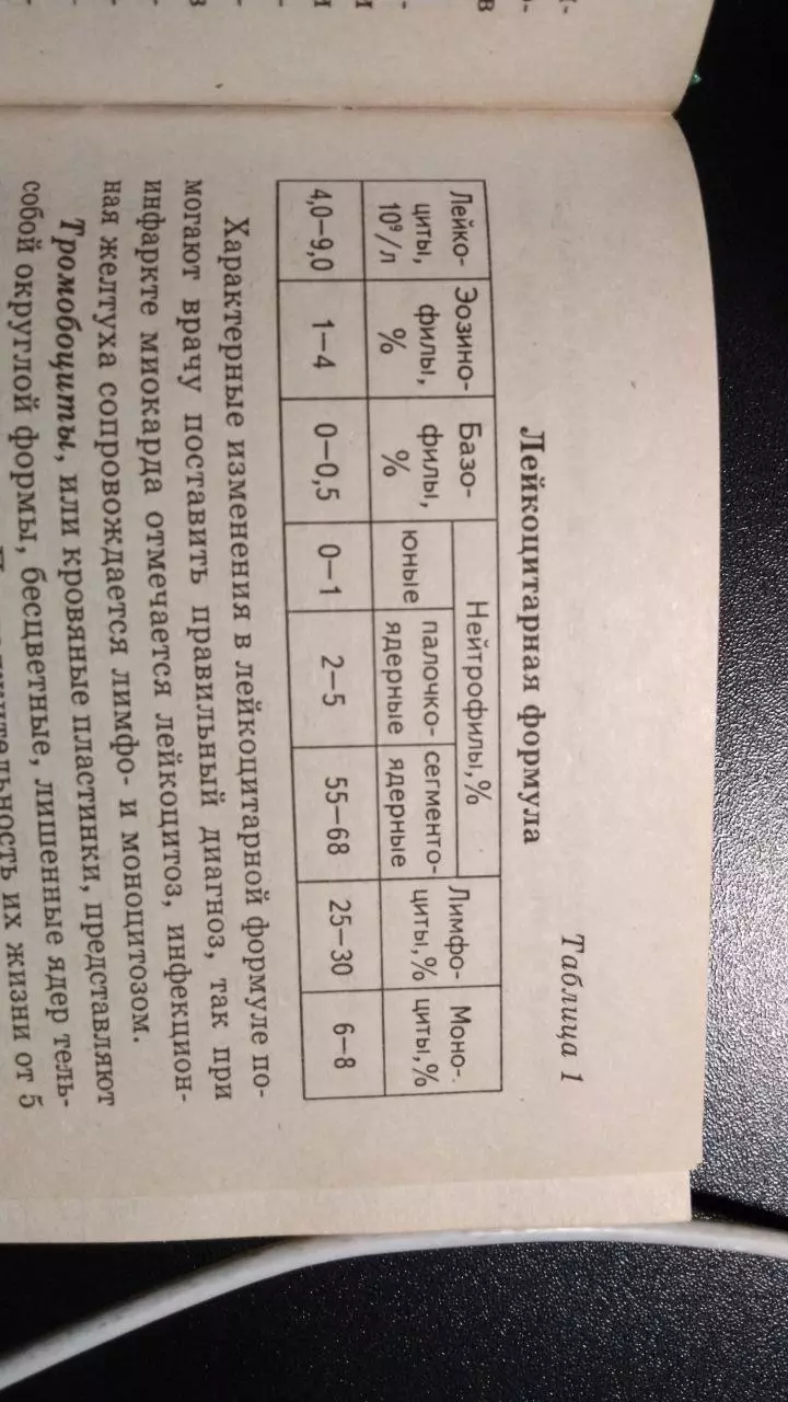 Ткани: "Внутренняя среда организма. Кровь" Суть и основа раздела: "Внутренняя среда организма. Кровь" Внутренняя среда организма представлена кровью, лим- фой и тканевой жидкостью. Она обеспечивает связь меж- ду клетками организма, имеет постоянный состав и физи- ко-химические свойства. Постоянство внутренней среды является необходимым условием нормальной жиз- недеятельности организма и называется гомеостазом. Значение крови в организме огромно. Она выполняет следующие функции: 1— доставляет питательные вещества и кислород к клеткам тканей; 2— удаляет продукты метаболизма из клеток тканей; 3— обеспечивает гуморальную регуляцию организма (при помощи гормонов); 4— выполняет защитную функцию (выработка анти- тел и способность к свертыванию); 5— участвует в процессе терморегуляции. В организме взрослого человека содержится около 5 л крови, или 6-8% от массы тела. Кровь состоит из жидкой части — плазмы крови (55-60% от общего объема крови) и форменных элементов — клеток (гематокрит 40—45%). К клеткам крови относятся: эритроциты (красные кровя- ные тельца), лейкоциты (белые кровяные тельца), тром- боциты (кровяные пластинки) Плазма крови — это жидкость желтоватого цвета. Она содержит 92% воды, 7% белков (альбумины, глобулины, фибриноген), 0,1% глюкозы, 0,9% минеральных солей. Плазма крови имеет слабощелочную реакцию (pH 7.36— 7.42), осмотическое давление ее составляет 7,6-8,1 атм. Постоянство осмотического давления плазмы обеспечивает постоянное содержание воды в клетках и, следова тельно, постоянство их объема, что является необходимым усло- вием для правильного хода физиологических процессов. Вязкость крови — 5,0, а плазмы 1,7-2,2 (по отношению к вязкости воды, которая равна 1). Удельная плотность кро- ви — 1,050-1,060, плазмы — 1,025-1,034, эритроцитов — 1,090. Состав и свойства плазмы крови постоянны и мало изменяются. Плазма крови без фибриногена назы- вается сывороткой. Рис. 6. Мазок крови: 1 — эритроциты; 2 — нейтрофильный гранулоцит; 3 — эозинофильный гранулоцит; 4 — базофильный гранулоцит; 5, 6, 7 — лимфоциты; 8 — моноцит; 9 — тромбоциты Форменные элементы крови Эритроциты. — красные кровяные тельца имеют фор- му двояковогнутых дисков размером 7—8 нм. Зрелые эрит- роциты не имеют ядер. Основной функцией эритроцитов является транспорт кислорода и углекислого газа. У здо- рового человека в 1 мм3 крови содержится от 4 млн до 5 млн эритроцитов, или 4,0—5,0 х Ю12 в литре. Образуются эритроциты в красном костном мозге (до 10 млн ежесе- кундно), а разрушаются в селезенке и печени. Про- должительность их жизни 120—150 дней. В состав эрит- роцитов входит гемоглобин, состоящий из белка (глоби- на), содержащего железо (гем). Гемоглобин переносит кислород и углекислый газ. В норме содержится 140 г/л гемоглобина: у женщин — 120-140 г/л, у мужчин — ISO- 155 г/л. Гемоглобин легко вступает в реакцию с кислоро- дом, образуя неустойчивое соединение — оксигемоглобин. Отдав кислород в тканях, оксигемоглобин восстанавли- вается и соединяется с углекислым газом, образуя карбо- гемоглобин. Уменьшение гемоглобина и эритроцитов в крови называется анемией. Форменные элементы крови находятся в плазме во взве- шенном состоянии, благодаря непрерывной циркуляции крови в сосудах. Но если кровью заполнить пробирку и оставить стоять, то через некоторое время можно наблю- дать оседание эритроцитов, наступающее из-за разной от- н