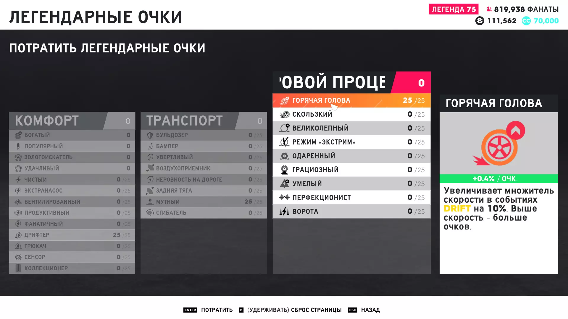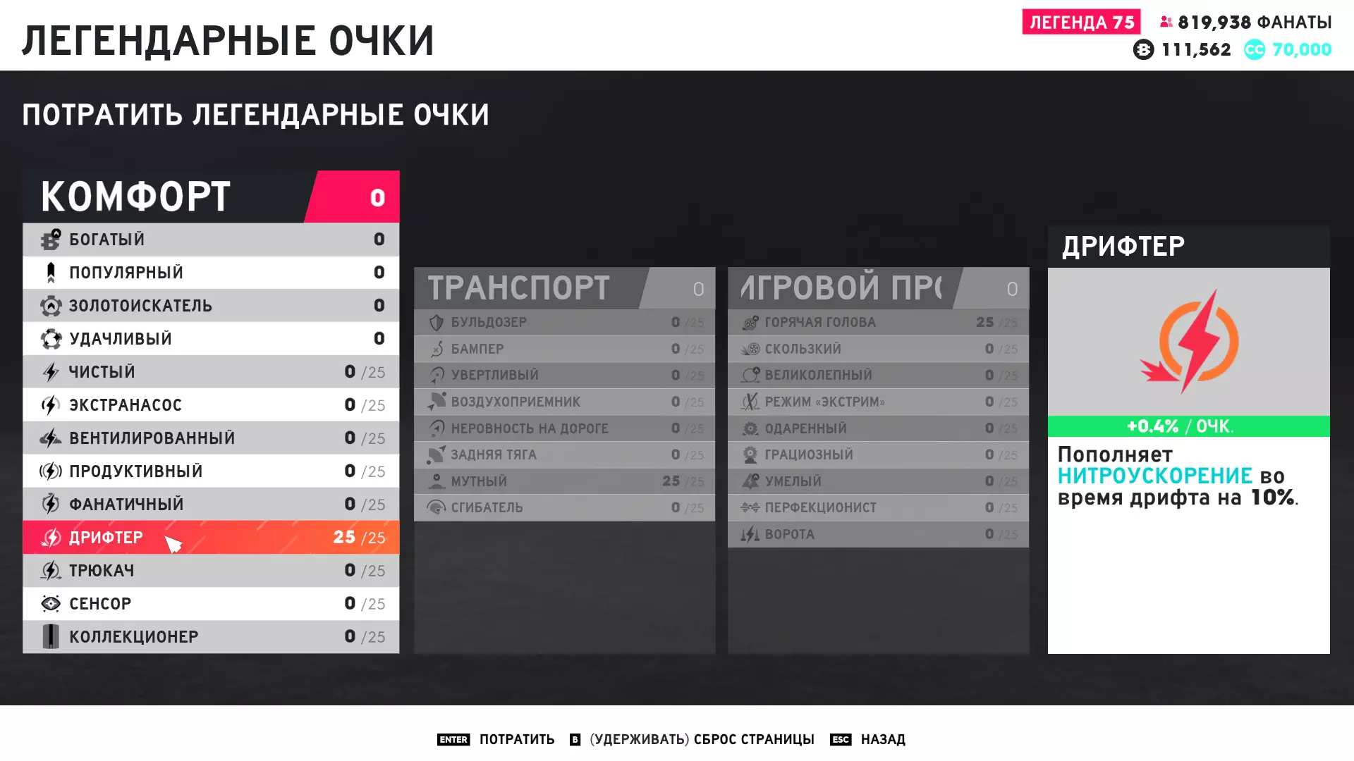 打开地图以让订阅者被记录,然后关闭地图继续漂移。 最后,我们根据需要重复此操作。 我个人通过漂移获取500名订阅者平均需要15-20秒(包括打开和关闭地图),即每分钟可获得1500-2000名订阅者,每小时(不间断)可获得90000-120000名订阅者。提高第一种方法的速度 为了提高刷取速度,理想情况下我们需要75级的传说等级(用于在漂移时强化3个主要的刷取技能)。 首先进入技能菜单,升级以下技能: 从舒适菜单中,升级【漂移者】技能。