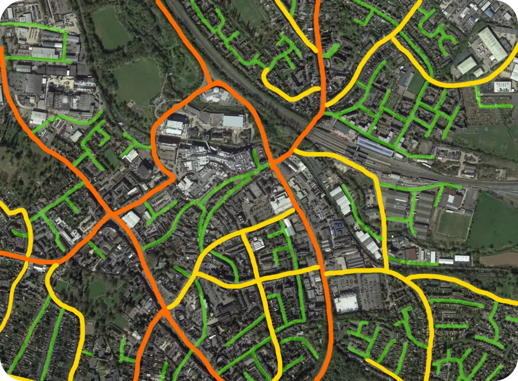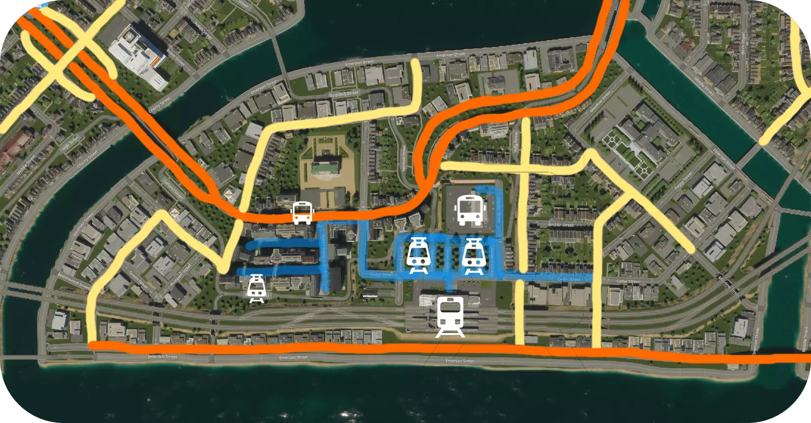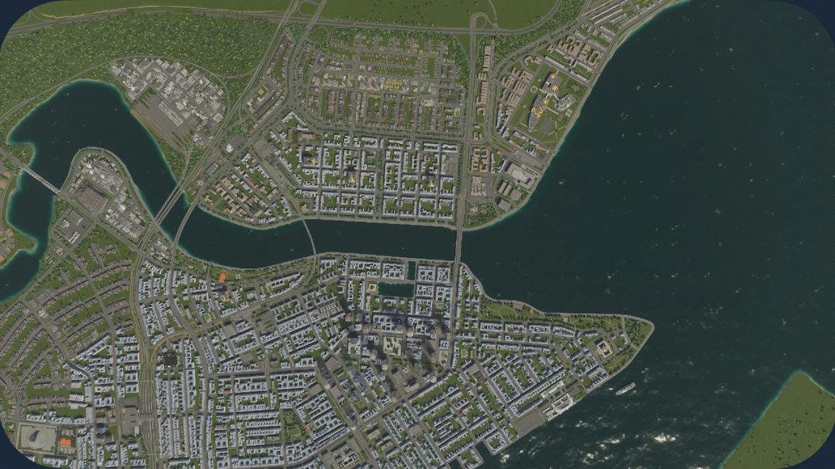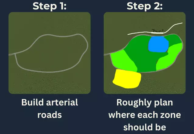 图像 ©2024 Airbus,地图数据 ©2024 Google 注意:橙色代表【主干道】(主要道路),黄色代表【连接道路】,绿色代表【本地道路】。 注意主干道是如何避开商业区所在的中心区域,而是从其周围绕行的。如果让主干道直接穿过商业区,会导致交通严重拥堵,因为车速会大幅下降。通过在市中心周围设置两条主干道,可以避免因一条道路拥堵而导致整个城市交通陷入停滞,车辆可以改走另一条主干道。 分步指南 你不一定需要执行以下步骤。但如果你是新手且正在为交通问题困扰,可以尝试按照这些步骤操作: