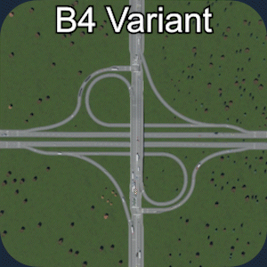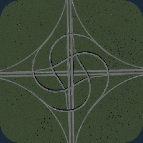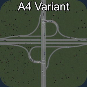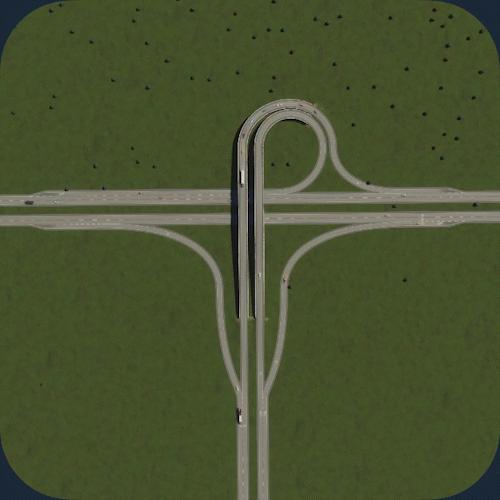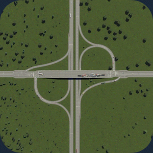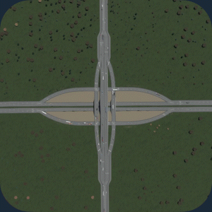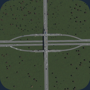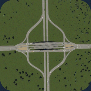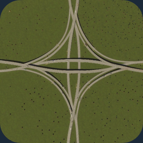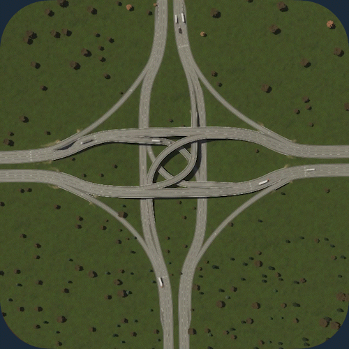 交通流量:5/5 空间利用率:3/5 建造难度:5/5 - 立体交叉 优点:非常高效地快速疏导大量交通。由于转弯车道非常宽阔,车辆转弯时几乎不会减速。非常适合处理高交通流量。 缺点:由于需要高速行驶,因此占用大量空间。不适合城市区域。 建造方法:教程 现实案例:地图 你也可以在基础游戏的【交叉路口】分类下找到它。 编织式立体交叉