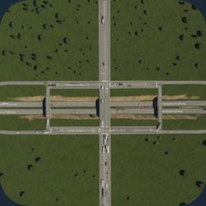 交通流量:4/5 空间利用率:2/5 建造难度:4/5 - 你可以修改“十字路口”分类下的预设苜蓿叶式立交 优点:本质上是改良版的苜蓿叶式立交,没有交织问题。能很好地处理大量交通。 缺点:是现有最大型的立交之一。如果空间有限,不建议使用。 建造方法:教程 提示:无需建造两条驶出匝道。如果只有一侧存在交通问题,只需在该侧建造“跨线桥”匝道。 涡轮式立交