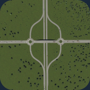 交通流量:3/5 空间利用率:2/5 建造难度:4/5 优点:分离式菱形互通式立交将交通分散到多个交叉路口,减少单点拥堵。由于转向车道更宽,其效果可能比普通菱形立交更好。 缺点:需要更多土地,因为道路必须再次合并。这种合并大约需要100米的土地,且由于道路曲率,该区域无法用于其他用途。 建造方法:目前尚无现成方案,但建造过程非常简单。 现实案例:未找到现实中的实例 密歇根城市菱形立交