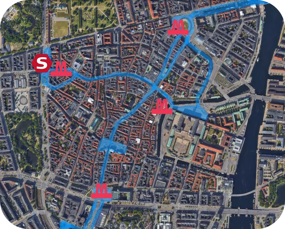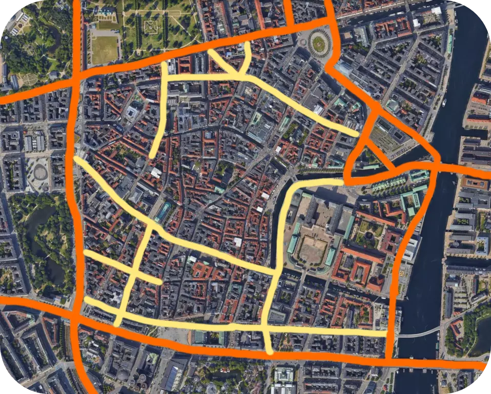 通常是行人造成了交通问题。如果有大量行人过马路,汽车就必须等很长时间才能继续行驶。 在小路上通常没什么问题。但大量汽车和大量行人往往会造成严重的交通问题。 但请记住:行人是解决方案,而不是问题所在。每多一个行人,路上就少一辆车。处理大量行人很容易,但处理大量汽车却很难。因此,许多交通问题的解决办法是让步行和乘坐公共交通变得更便捷,而不是把重点放在汽车交通上。 提示:你可以使用【Traffic Light Enhancements】模组,将路口配置为“行人专用相位”。这会让行人优先于车辆通行,在某些情况下可以解决交通问题。更多内容请查看【必备模组】部分。 如何解决行人造成的交通问题?解决这些问题的最佳方法是避开行人和车辆密集的交叉路口。你需要考虑:哪里是行人密集的热点区域?可能是火车站、公交站、高密度区域等。 找到这些区域后,考虑如何减少或避免该区域的车辆通行。例如,可以在行人热点区域周围修建环路,让车辆远离热点区域而不是穿过它们。让我们来看看丹麦的哥本哈根。左侧是步行“热点区域”以及地铁和S线列车的连接路线。右侧则显示了汽车交通情况,其中橙色为“主干道”,黄色为“连接道路”。