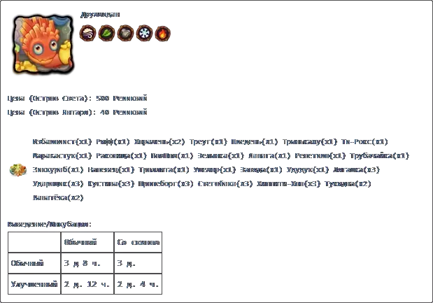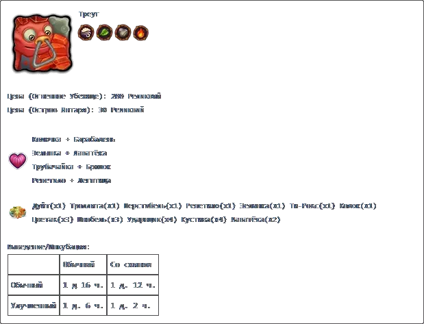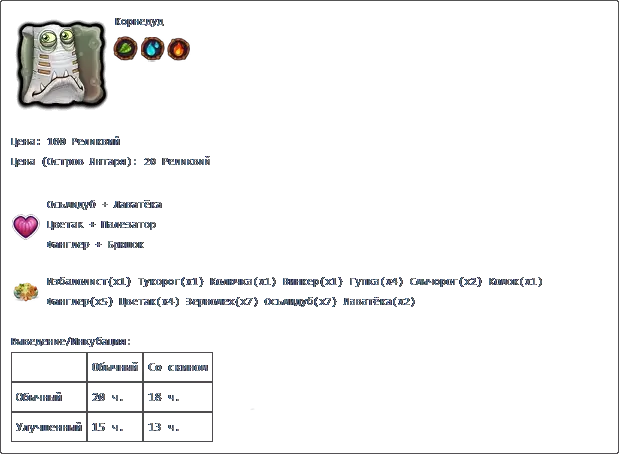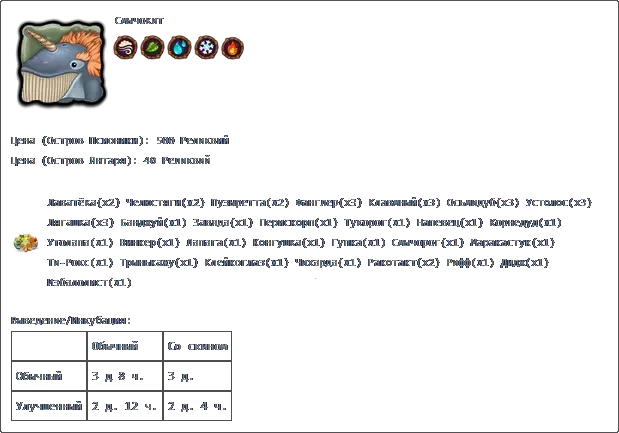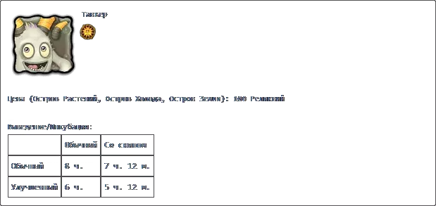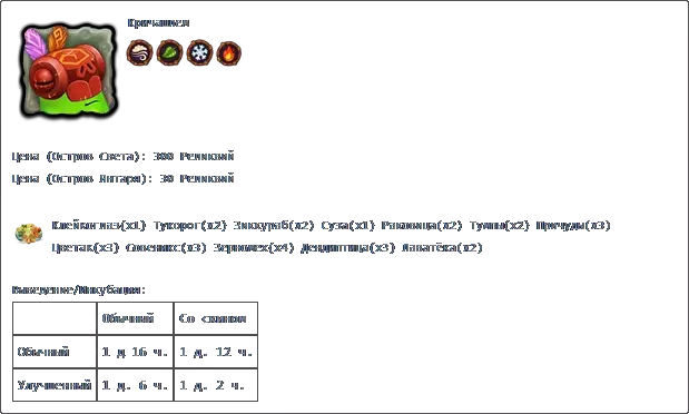 克莱克格莱斯+图科罗格 克莱克格莱斯+鲁巴 克莱克格莱斯+佩里斯科普 产出: 普通 带皮肤 普通 1天8小时 1天4小时48分钟 升级版 1天22小时48分钟 福格: 价格 成功 失败 100星 1天8小时 22小时 主要:莫斯科时间6:00至20:00(普通岛屿) 次要:莫斯科时间18:00至次日8:00(镜像岛屿)