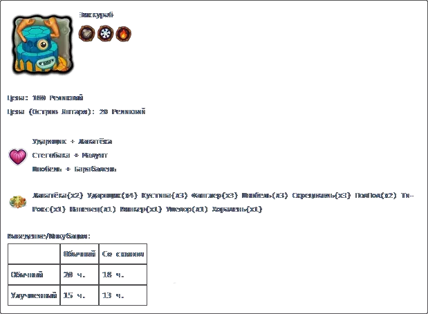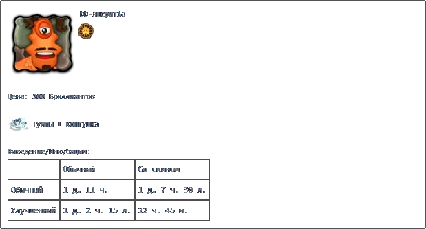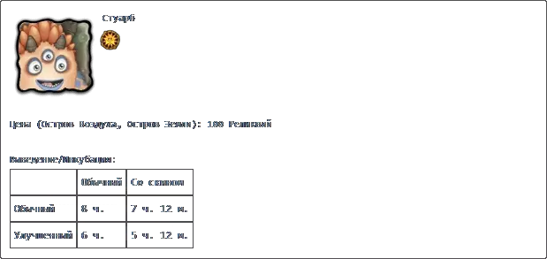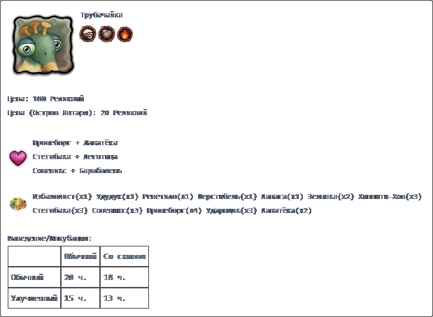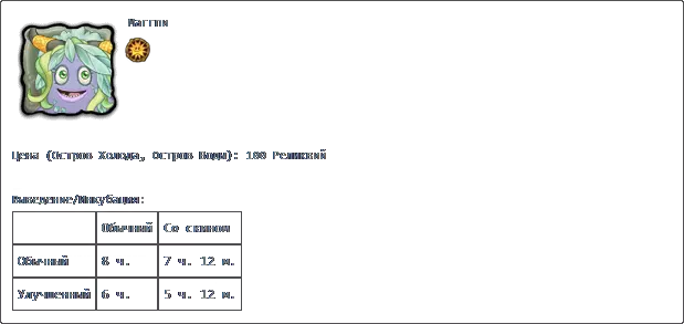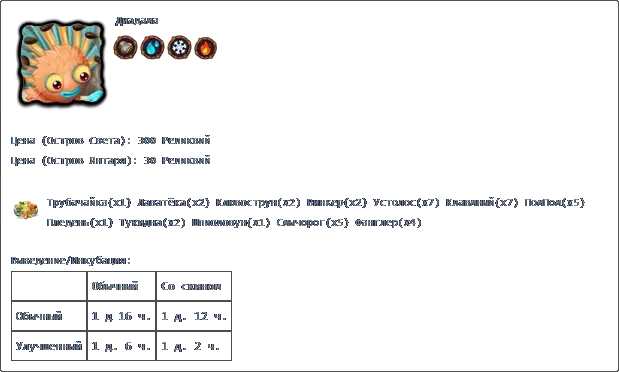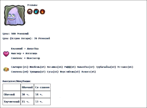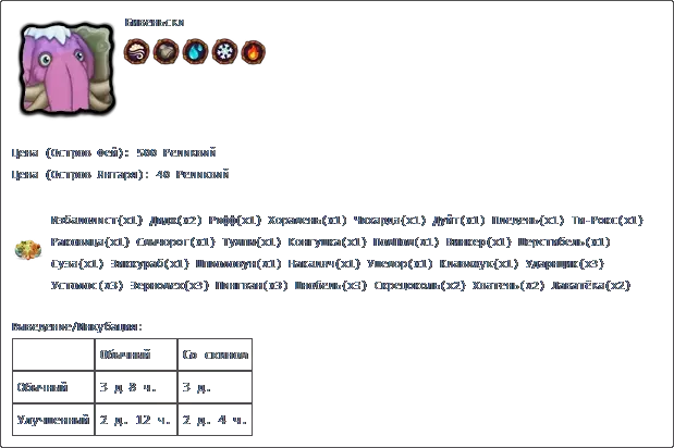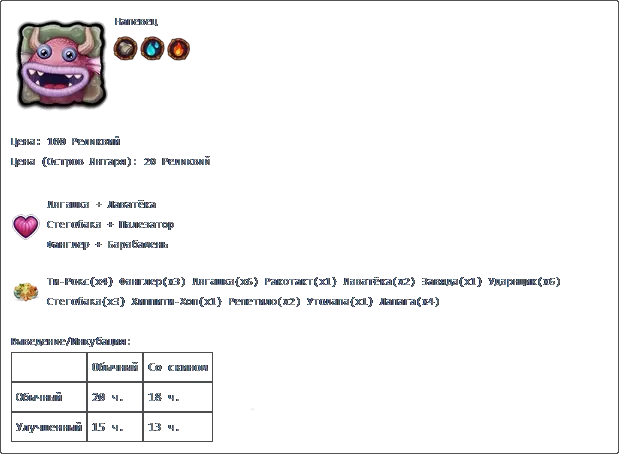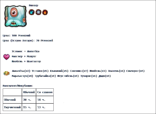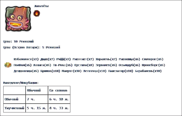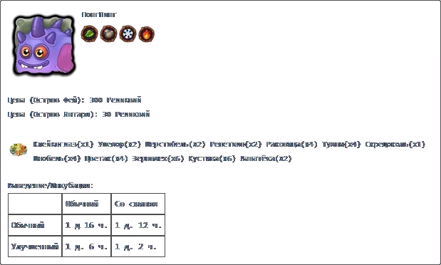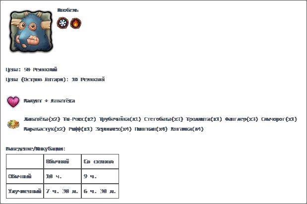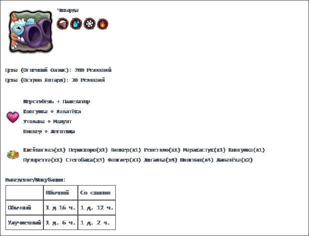 若收藏中有所有普通怪物,且调和锅中每种元素各有3个米巴(Миба),则可在调和锅中进行调和。 孵化:普通普通2天2小时