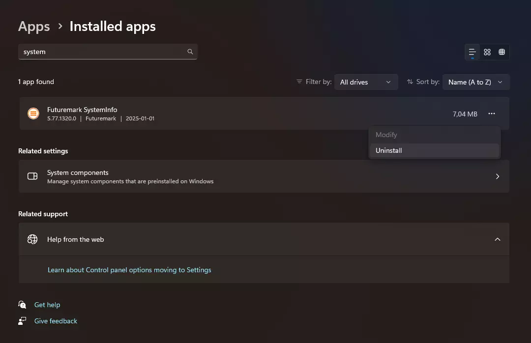 然后点击右侧的三个点并选择卸载。按照屏幕上的提示操作,直至程序被移除。 Win 10系统的操作流程与此非常相似,只是该页面名为【应用和功能】。 2. 安装旧版4.28版本 前往SystemInfo页面,向下滚动找到SystemInfo 4.28,点击名为【为旧系统下载SYSTEMINFO 4.28】的按钮。 或者,可以直接下载.msi文件。