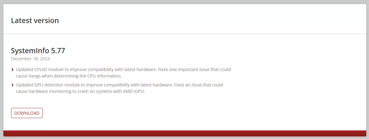4. 恢复至最新版SystemInfo 若要正常使用3DMark,需重新安装最新版SystemInfo。本次无需先卸载4.28版本,因为我们将升级至更新版本。但如果出于某些原因仍需卸载,可按照上一节中卸载当前版本的步骤操作。 再次访问下载页面,点击【下载】按钮获取最新版的.msi安装文件(撰写本文时最新版本为5.77)。点击下载的文件并运行以安装最新版SystemInfo。