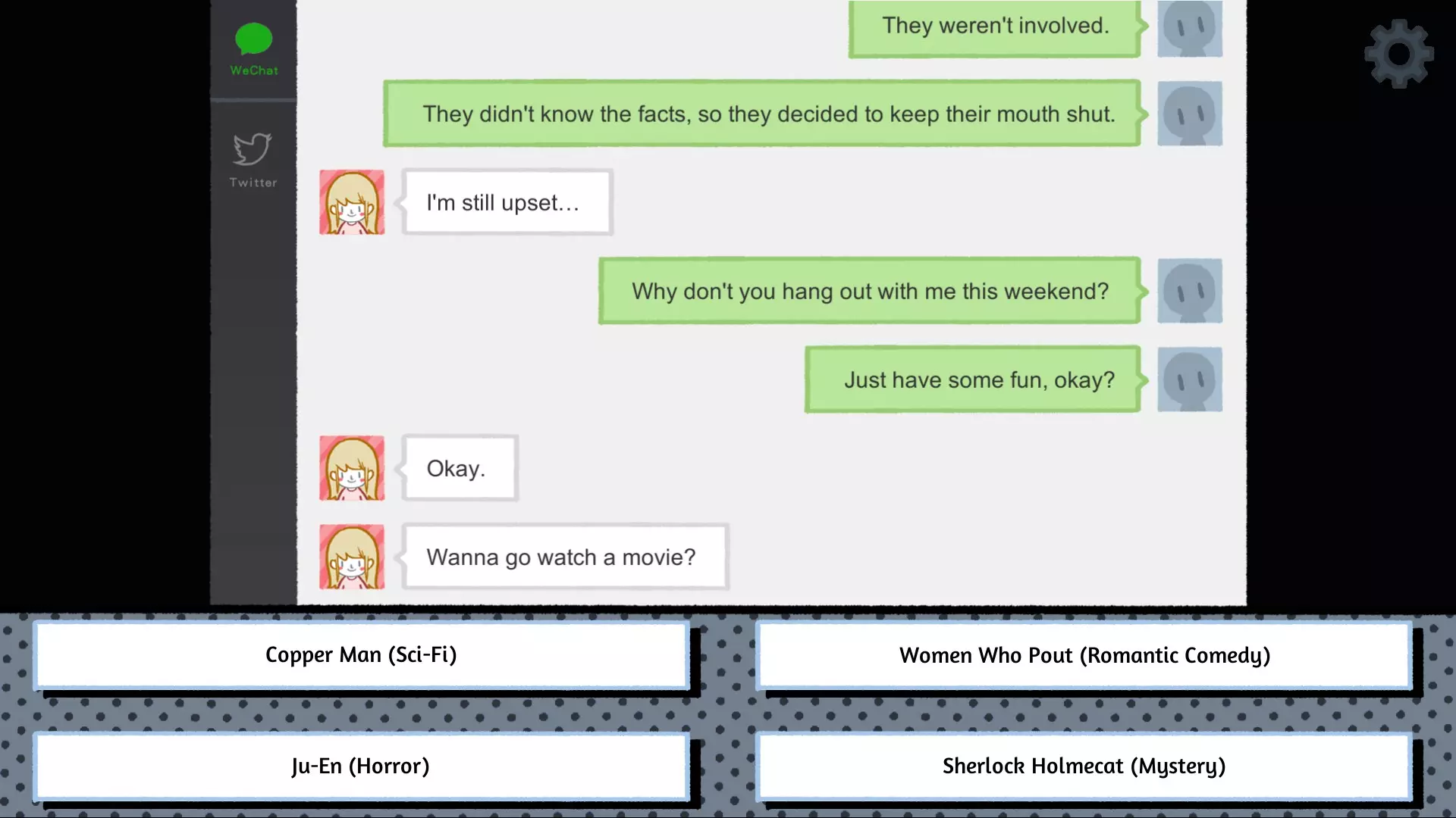 一切都很顺利! 爱•游戏★返回“微信”。 ☆“领导们一直都这样做。”/“也许你们只是彼此不理解?”; ☆“没人想惹领导生气。”; ☆“周末不想去散步吗?”; ☆【夏洛克·福尔摩猫】(侦探);