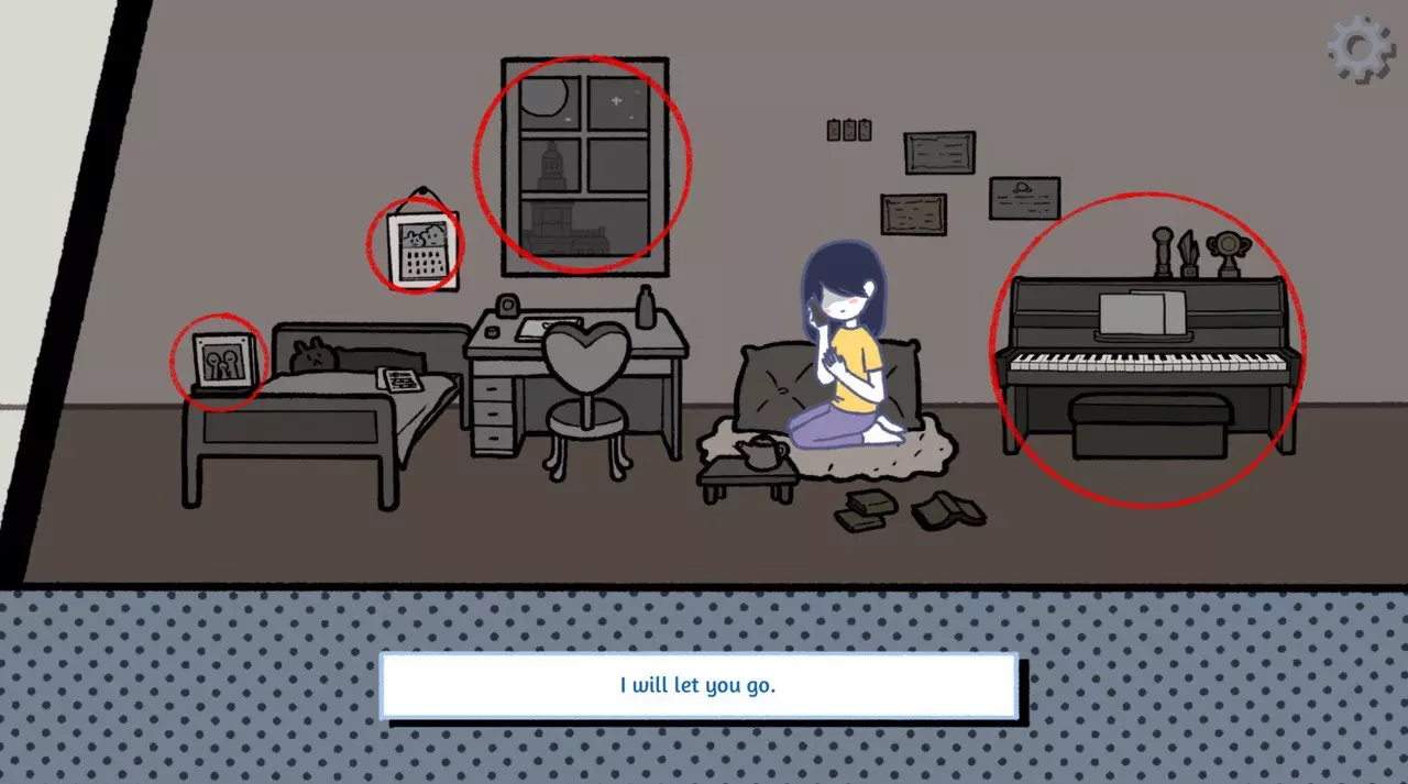 ★ 接着从女孩手中拿走螺丝刀; ★ 从节拍器底部取出某个塞子; ★ 当女孩哭泣时,点击钢琴; ★ 接着我们和女孩一起弹钢琴,需要在显示器边框闪烁时点击鼠标左键; 需要和女孩一起弹钢琴,只弹一个音符,但我第一次甚至第二次都没成功,因为本该帮助我的边框没有出现,不过大概在第5-6次时它出现了。接下来的岁月里,我们点击着这些物品: ★ 2002年:日历、书籍和带有磁盘的盒子; ★ 2004年:日历、电话、主板、教科书; ★ 2005年:日历、电话、书籍、收音机、电脑; ★ 2006年:乐谱、书籍; ★ 在汽车里点击“方向盘”; ★ 在游乐园里再次点击“方向盘”; ☆ “去做吧。我知道这是你的梦想。”