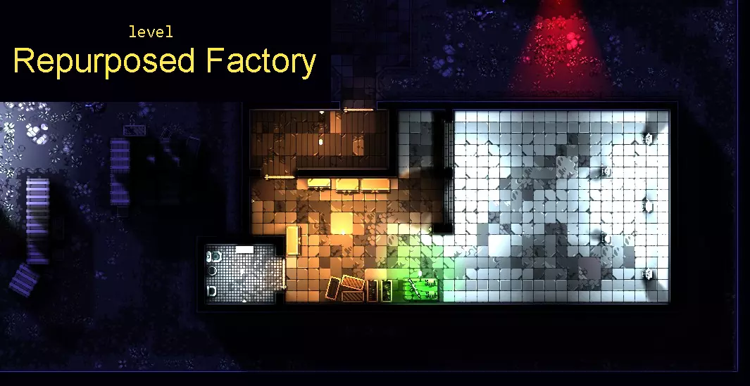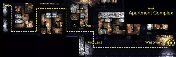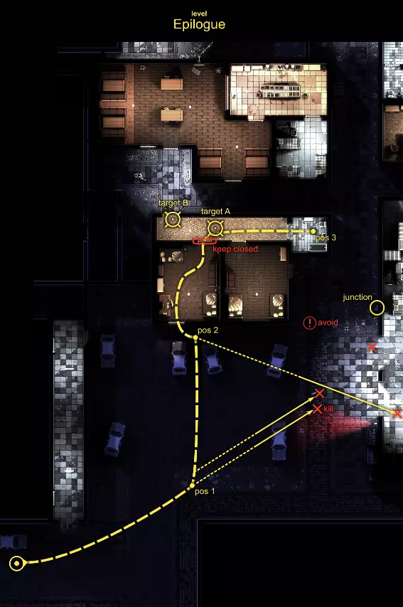 我的策略是在暗处用枪声吸引敌人,通过声音(枪声、敲击墙壁、 bathroomery)和尸体(可能会引来支援)将他们引诱过来。 1. 拿起MP5N和VP9。 2. 移动到3号位置。途中关闭所有灯光。 3. 在3号位置的黑暗中等待,瞄准目标A或B,射杀所有敌人。 保持那扇门关闭,因为它可能会干扰敌人的行动路线。 下方的两扇窗户可用于逃跑、重新定位以及射击外面的敌人。上方还有一个通风口也可以利用。 优先攻击静止或正朝你而来的目标,而非横向移动的目标。 一旦失手就重新开始。 4. 在某个时机,你可以关闭 Junction 来吸引敌人前往那里,并有助于击杀那些躲藏在仓库内或走进仓库的敌人。 5.在受虐狂难度下,在大约24/49击杀数时使用你的唯一存档。 6. 从这里开始,使用类似策略在关卡中行动。 FIG-D位置表。 level_id place_name weapon_name path position progress 01 (map_intro) 瘾君子贫民窟 n/a n/a n/a n/a 02 瘾君子贫民区 Glock-18C 从起点出发,前往目标点。 目标点所在建筑西侧,桶形营火上方,东北侧黄色照明房间内的桌子上。 1/10