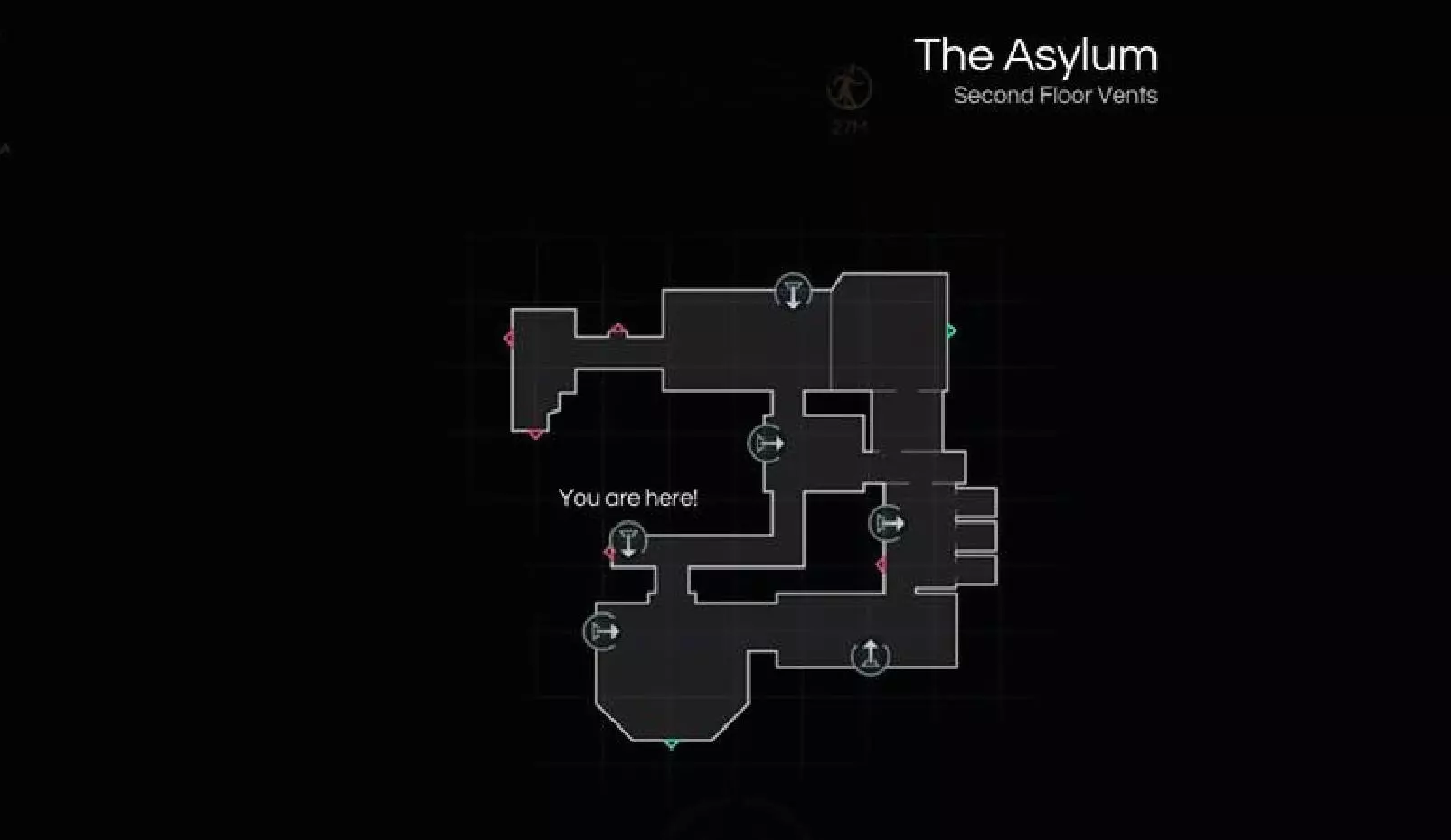 精神病院 卫生间、大厅和走廊里有很多弹药 保险丝经常出现在淋浴间、喷泉附近 箭头 - 前往下一个区域的入口