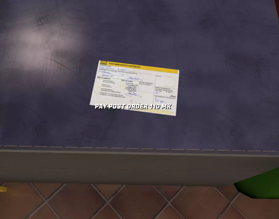 为了支付费用,玩家需要走到钢铁柜台后的维皮(PSK加油站的一名女员工)那里,查看柜台上的邮寄订单,并用钱包里的钱(不是银行账户)支付。零件盒会出现在柜台左侧,可供打开并带回家。