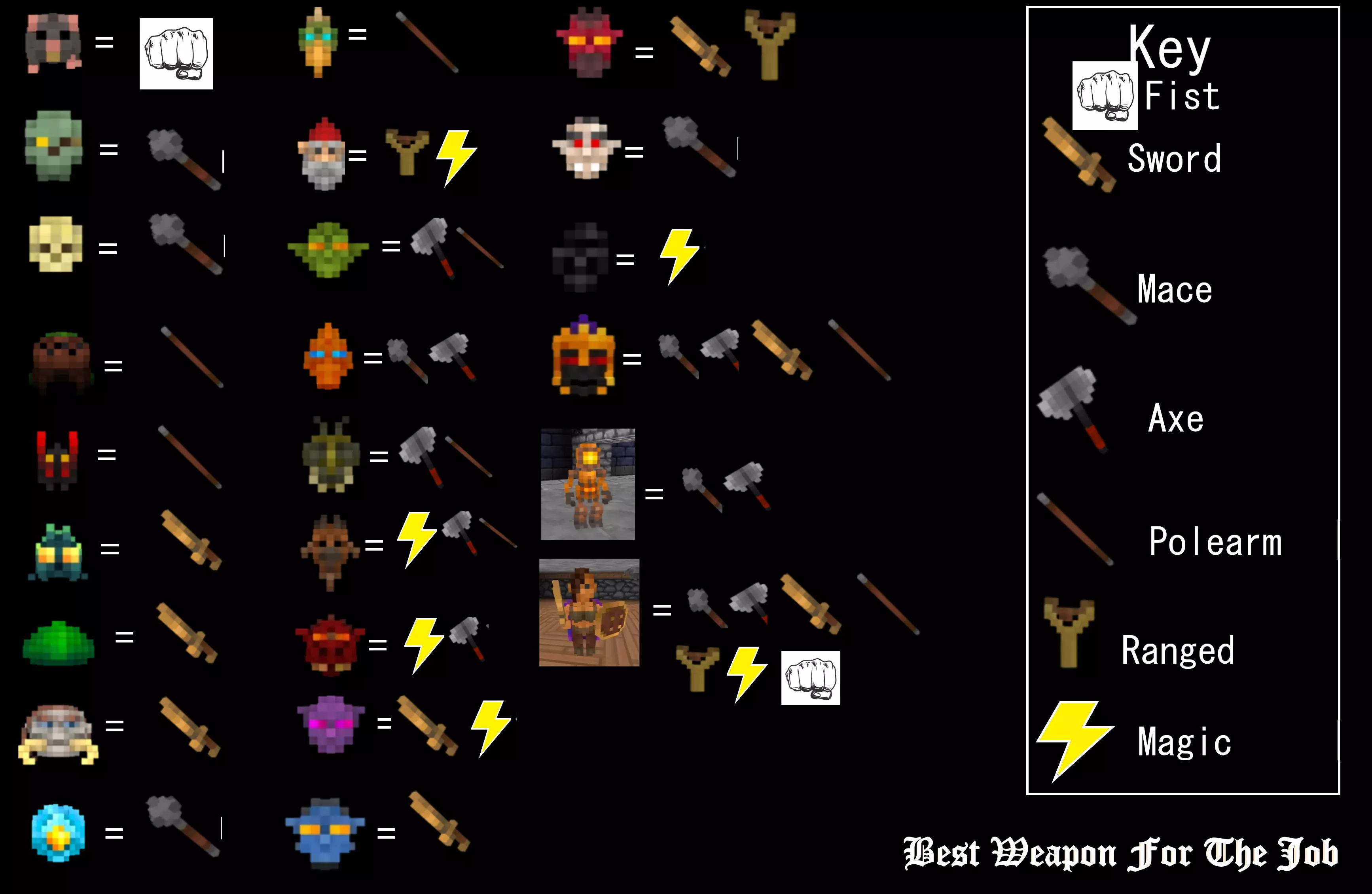 厌倦了永远不知道哪种武器最适合对付哪种怪物吗?用剑砍骷髅半天没反应?你的可靠宝剑对蜘蛛毫无作用?巨魔对你百般挑衅,你想快速解决它们?别再烦恼了,朋友,我来帮你。 本指南将为你提供每种怪物的属性和相关信息,并告诉你对付它们的最佳武器。今天我们就来学习一下。 简介 嘿,你可能已经注意到,在这款游戏中,用不同武器攻击怪物时,它们的死亡速度似乎有快有慢。这是因为怪物存在抗性和弱点。虽然很多游戏中武器选择更多是个人偏好,但在《巴罗尼》中,建议你携带多种武器。 这款游戏可不是闹着玩的,你随时可能死亡。就像高中时我约那个女生出去,结果她当着整个自助餐厅的人拒绝了我一样。没错,就是那种内心死寂的感觉。 咳咳,言归正传。本指南简单直接,易于遵循。我在下方附上了图片,只需将面孔与你感兴趣的怪物匹配,就行了! 图中已选出最适合的武器,但有时其他武器也能有同样效果,这种情况下怪物面孔旁会列出多种武器。 事先声明:所有内容均来自维基。我仔细研究了游戏代码中每个怪物的完整属性图表以及各武器对怪物的伤害倍率。 有时一些稍弱的武器不会出现在图片中。记住,要携带多种武器,而不只是一种类型。(当然,如果你愿意,只带一种也完全可以。)