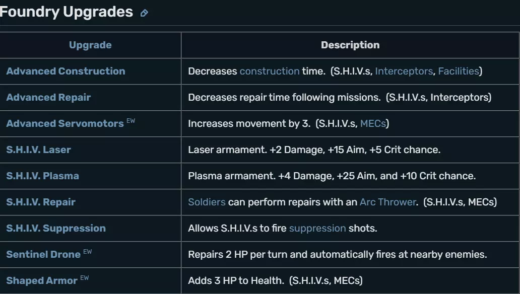 Medals WIP Outside ground to ground combat What?! Did you really expect me to write out all of that? No I am not. Deal with it. Research priorities This is generally the order I research various items (this doesn't include autopsies or interrogations, I generally wait until I can get full coverage over South America to make them become instant--except for the Outsider interrogation since that advances the story). Xenobiology -> unlocks Alien Containment Weapon Fragments -> unlocks SCOPE Alien Materials -> unlocks nanofiber vests Arc Thrower -> to capture aliens Beam Weapons -> allows to build laser rifles Carapace Armor -> allows you to build better armor (YOU WILL NEED this for Chryssalids) Experimental Warfare -> unlocks Foundry UFO Power Source -> unlocks Elerium Generator Heavy Lasers -> lasers cannons for Heavies Laser Pistols -> laser pistols for sidearms Alien Grenades (Foundry, if available) Improved Medikits (Foundry, if available) Tactical Rigging (Foundry, if available) Alien Nav Computer -> unlocks Satellite Nexus Elerium -> unlocks Titan Armor Stealth Satellites -> UFOs that aren't shot down can't find sateliites Plasma Rifles -> allows to build plasma rifles Titan Armor -> allows you to build titan armor Ammo Conservation (Foundry, if available) Improved Arc Thrower (Foundry, if available) New Fighter Craft -> unlocks the Firestorm fighter, the best in game Heavy Weapons Platform (Foundry, if available) SCOPE Upgrade (Foundry, if available) Outsider Shard -> unlocks alien base assault mission * Fusion Lance -> best fighter weapon in the game Sentinel Drone (Foundry, if available) -> SHIVs can repair themselves SHIV Suppression (Foundry, if available) -> SHIVs can do suppressing fire SHIV Laser -> SHIV weapons upgraded to lasers Meld Recombination -> unlocks MECs and Gene Mods for soldiers Skeleton Suit -> armor that I don't use but to count towards research Archangel Armor -> armor that I don't use but to count towards research Heavy Plasma (2 needed) -> build Heavy Plasma for Heavies Advanced Repair -> shorter repair times Advanced Flight (Foundry, if available) -> more flight time Shaped Armor (Foundry, if available) Blaster Launcher (2 needed) FOCUS SHOULD NOW BE ABOUT DESTROYING EXALT'S HEADQUARTERS Alloy Cannon -> unlocks alloy cannons for assaults ASSAULT THE ALIEN BASE DEFEND HEADQUARTERS OVERSEER SHIP MISSION WORK ON BEATING THE GAME How to maximize saving countries https://steamcommunity.com/sharedfiles/filedetails/?id=809053440 I am not copy and pasting all of that in here just no. Besides go give the man some credit. Second Wave Options The following Second Wave options are available by default: Damage Roulette: Weapons inflict a wider range of damage (minimum 1 damage, and maximum 150% of the weapon's base damage). Does not apply to explosives. Random damage range varies between 1 and the weapons' base damage + 50% (rounded down), a critical hit adds the base damage value to the previously calculated random damage. Example: an Assault Rifle with a 3 damage stat can deal up to 1-4 damage or 4-7 critical damage. New Economy: Randomizes funding provided by Council members from 10% to 400% of regular funding. Not Created Equally: Rookies have random initial stats. Range of Will: 25~59 (normal 40), values will vary by increments of 2 to the lower 25 limit. Range of Aim: 50~80 (normal 65), varies in increments of +5. Note that this is one way to make the Heavy class more useful in the endgame, at the expense of having to hire, screen and fire a lot of soldiers after getting the OTS New Guy perk. Range of Movement: 11~14 (normally 12), 1/3 chance of getting 11, 1/3 chance for 12, 1/6 chance for 13, 1/6 chance for 14 movement. All soldiers will have the same Health Points, value is defined by the difficulty level. Hidden Potential: As a soldier is promoted, their stats increase randomly. Normal Difficulty If the player completes the game on Normal difficulty, additional Second Wave options are unlocked: Red Fog: Combat wounds degrade the soldier's Aim and Movement attributes for the remainder of mission. Does not impact Aliens (reference). Absolutely Critical: A flanking shot guarantees a critical hit. The Greater Good: Psionics can only be learned from interrogating a psionic alien. Marathon: The game takes considerably longer to complete. Causes a delay in the initial deployment of most alien species, triples research time, doubles facility construction time, doubles infirmary recovery time, and doubles the cost of Engineering projects (i.e. constructing facilities and items). This increases the difficulty of the early game. Classic Difficulty XCOM-EU 2nd wave If the player completes the game on Classic difficulty, additional Second Wave options are unlocked: Results Driven: The funding provided by each nation is determined by its panic level. +25% funding at level 1 panic, ±0% funding at level 2 panic, -25% at level 3 panic, -50% at level 4, -75% at level 5. High Stakes: Random rewards for stopping alien abductions. Diminishing Returns: Increased cost of satellite construction. More Than Human: The psionic gift is extremely rare. Impossible Difficulty If the player completes the game on Impossible difficulty, additional Second Wave options are unlocked: War Weariness: Council funding decreases over time. E-115: Elerium degrades over time. Total Loss: Lose all soldier gear upon death. Alternate Sources: Doubles the power requirements to build facilities. EW adds more choices to second wave options The following Second Wave options are available by default: Aiming Angles: Units receive Aim bonuses the closer to flanking an enemy they are. Save Scum: Loading a saved game will reset the random number seed, so taking an identical action may yield different results. Training Roulette: Each soldier's training tree is mostly randomly generated. Does not apply to MEC Troopers.If the player completes the game on Normal difficulty, additional Second Wave options are unlocked: 