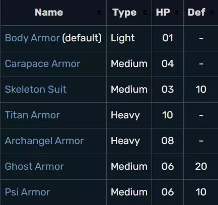 所有护甲 身体护甲供士兵在战斗任务中抵御外星武器和环境危害。所有士兵均可装备身体护甲,但机械化外骨骼士兵(MEC Troopers)除外,他们装备的是机械化外骨骼(MEC suits)。所有身体护甲都会为士兵提供额外生命值。针对这种【护甲生命值】造成的伤害不会导致士兵受伤;只有当士兵在任务中损失部分基础生命值(状态面板中显示的绿色数字)时,才需要恢复时间。此外,士兵可以在物品栏中装备纳米纤维背心、几丁质镀层或呼吸植入体来补充【护甲生命值】。 幽浮:未知敌人 身体护甲 轻型护甲。这是所有XCOM部队的默认身体护甲。增加+1生命值。甲壳甲 中型护甲。增加4点生命值,但无特殊加成。 骷髅服 中型护甲。增加3点生命值和10点防御力,允许穿戴者使用抓钩到达更高的有利位置,并提升3点移动速度。 泰坦甲 重型护甲。提供10点生命值以及火焰和毒素免疫。在《幽浮:内部敌人》中还会获得窒息免疫。 大天使甲 重型护甲。提供8点生命值,允许6次飞行移动。可升级为每次任务12点燃料。《幽浮:内部敌人》中增加了火焰、毒素和窒息免疫。 幽灵甲 中型护甲。允许穿戴者在每次任务中隐形4次,每次持续一整回合(包括幽浮方和敌方回合)。还包含抓钩,提升3点移动速度,增加20点防御力和6点生命值。《幽浮:未知敌人》新增了对火焰、毒素和窒息的免疫效果。 灵能甲 中型护甲。灵能甲是游戏中最后可用的护甲,仅能由拥有灵能能力的士兵装备。提供+6生命值。与游戏内描述相反,它提升20点意志而非30点。此外,该护甲还有隐藏的+10防御加成和+2移动力。