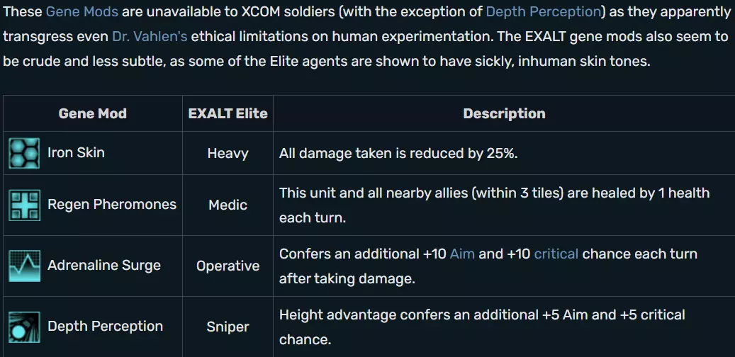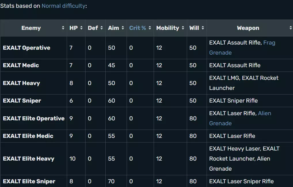 Ethereals have 100 aim for easy/normal and 110 aim for classic/impossible; 40 defense; 20 health for all difficulties except for impossible where they have 25; 12 mobility; and 120 will for easy/normal, 145 will for classic, and 155 will for impossible. he Ethereals are the psionically gifted, yet physically frail leaders of the alien invasion. Possibly due to extreme age or the energy requirements of their overdeveloped brains, their bodies have atrophied to an alarming degree. Some of their organs are underdeveloped and some sensory organs are not working at all. Despite being physically infirm, they are extremely resilient in combat and their devastating mental abilities can wipe out an entire XCOM squad in short order. The Ethereals used a combination of mind control and forced evolution to subjugate and mold the numerous races that comprise the alien invasion. Many of the races that XCOM faces were uplifted by the Ethereals and experimented on in order to create superior beings. Ultimately, they were all deemed failures and now serve as shock troops for subsequent invasions. The only way Ethereals fight is with their abilities which are mindfray (Causes the target to lose grip on reality, inflicting penalties to Aim, Will, and mobility, and doing 5 base damage. Robotic units are immune. Lasts 2 turns, 1 turn cooldown.), rift (Devastate an area with a storm of psi energy. The rift does more damage against targets with low Will, and reduced damage against target with high Will. 4 turn cooldown.), psi lance (Project a bolt of pure psi force at an enemy.), mind control (Very difficult psi technique that, if successful, grants control of the target for 3 turns. Does not work on robotic enemies. 5 turn cooldown.), and psi drain (Drain health from an ally.) They also have the hardened trait. The first Ethereal is encountered during the Overseer Crash Site mission; if playing XCOM: Enemy Within, it is possible to encounter an Ethereal first during the XCOM Base Defense mission instead. Ethereals replace Sectoid Commanders on any UFO Crash Site or UFO Landing Site mission thereafter. Ethereals are typically accompanied by one or more Muton Elite. Exalt: Who the heck are these guys EXALT is a secret human paramilitary society determined to seize power while the governments of Earth are distracted with resisting the alien invasion in 2015.They are the new enemy faction introduced in XCOM: Enemy Within. They conduct operations targeting XCOM starting in May (the 3rd month of the invasion). While not allied with the aliens, EXALT harbor transhumanist ideals and sympathize with the aliens' effort to evolve the human species; where others fear or resist the alien invasion, EXALT see it as their opportunity to acquire the resources they need to seize power. So, like XCOM, EXALT is operating in the shadows and endeavoring to recover alien technology and develop sophisticated human genetic modification protocols, but unlike XCOM, their ultimate goal is to establish a world government under their control. EXALT works to disrupt XCOM's activities as they see XCOM as a rival in the acquisition of alien technology and an impediment to the aliens' human experimentation. To this end, EXALT sets up sleeper cells in Council nations around the world; the cell's hidden presence magnifies the effects of any panic the country may receive. Furthermore a cell can go active, performing one of three different EXALT Operations against XCOM: Sabotage, steals funding from XCOM; Propaganda, increases panic in the country where the cell is located; or a Research Hack, reverses progress on the project currently being researched. In addition to the strategic threat posed by EXALT, the organization's paramilitary agents present a very real tactical threat during Covert Operations. The following EXALT soldiers may be encountered in the field: EXALT Operative, EXALT Medic, EXALT Heavy, and EXALT Sniper.When first encountered, EXALT forces utilize conventional weapons that equal those of XCOM. In fact, EXALT weapons retain the same stats as their XCOM equivalents despite their visual differences; EXALT small arms are dark-colored, sleek or angular, and have elements reminiscent of modern real world (mixed western-european) firearms. As the game progresses, XCOM will encounter Elite soldiers who wear armor and utilize laser weapons and equipment that is also on par with XCOM's technology. Although EXALT weapons have completely the same stats in game mechanics as the XCOM counterparts, they tend to fire in a visually different way like performing a different burst of fire in numbers of shots. This is purely cosmetic. EXALT weapons can be recovered after a mission to be used by XCOM soldiers or can be sold via the Gray Market. Council members may request a stock of EXALT weapons in return for a larger cash bonus than would be received from a normal sale, similar to requests for pieces of alien technology. Exalt soldiers