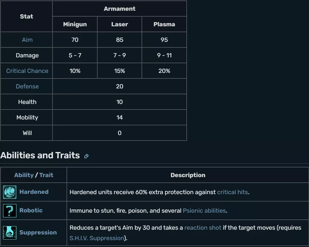The Mechanized Exoskeletal Cybersuit Trooper is a new soldier class introduced in XCOM: Enemy Within. MEC Troopers are not generated at random during Rookie promotion like other class assignments, but are created by augmenting soldiers in the Cybernetics Lab. Rookies and Psionic soldiers are ineligible for augmentation.Converting a soldier to a MEC Trooper is a permanent class change. They lose their abilities and Gene Mods, but retain their stats, rank and experience. MEC Troopers do not use the same weapons or equipment available to the other classes but instead utilize Mechanized Exoskeletal Cybersuits in combat. MECs grant MEC Troopers significant health and Will bonuses, access to heavy weaponry and advanced Tactical Subsystems, as well as immunities to fire and poison; they also gain the Hardened trait. MEC Troopers wear their Base Augments when outside of a MEC Suit. In comparison to the standard rifles used by Rookies, Supports and Assaults, MEC Trooper weapons provide a +2 base damage bonus and a +4 Crit damage bonus. This effectively raises the MEC Trooper's weapon by one tech level (i.e. the damage output of the Minigun matches that of the Laser Rifle); their damage within a given tech level is surpassed only by the Sniper's Headshot ability, which is able to inflict comparable critical damage to targets, but with much greater frequency. Upon undergoing augmentation, MEC Troopers gain a special inherent ability based on their previous class: Assault Class, damage received from enemies within 4 tiles is reduced by 33%; Heavy Class, The nearest visible enemy suffers -20 Aim and cannot critically hit this unit; Sniper Class, Any shots taken without moving have +10 Aim and +10% critical chance; Support Class, Nearby allies in cover receive +10 Defense. Additionally, MEC Troopers gain experience and ranks conventionally and have their own unique training tree: Rank1-Squaddie Collateral Damage: An area of effect attack that destroys most cover and hits all eligible targets for 34% damage. This attack cannot cause critical hits. Rank2-Corporal Advanced Fire Control: Shots from Overwatch no longer suffer any Aim penalty. Automated Threat Assessment: Confers +15 Defense when in Overwatch. Rank3-Sergeant Vital-Point Targeting: Confers +2 Damage against all humans and autopsied aliens. Damage Control: When a MEC takes damage, all further damage will be reduced by 2 for the next 2 turns. Rank4-Lieutenant Jetboot Module: When activated, confers the ability to jump to normally inaccessible heights for the rest of the turn. One For All: When activated, the MEC becomes a high cover element. Moving or using an arm-based weapon will return the MEC to standard posture. Rank5-Captain Repair Servos: Confers 2 health recovery at the start of each turn. A total of 6 health can be regenerated per battle. Expanded Storage:Allows additional use of Restorative Mist, Grenade Launcher and Proximity Mine Launcher in each mission. Increases primary weapon base ammo by 50%. Rank6-Major Overdrive: Firing the MEC's primary weapon as the first action no longer ends the turn. Rank7-Colonel Absorption Fields: Any hit that does more damage than 33% of the MEC's maximum health is reduced to that number. Reactive Targeting Sensors: The MEC gets a free shot back at the first enemy who attacks the MEC each turn, provided there's enough ammo to do so. When equipped with a MEC Suit, MEC Troopers gain the hardened trait. Mec class continued MEC Troopers have the most complex skills and customize builds of any soldier class. Players who have completed the game on Classic or Impossible difficulty levels, recommend choosing Vital-Point Targeting, Jetboot Module and Expanded Storage. Inherent Ability MEC Trooper skills should complement their inherent ability for a common purpose. Shock-Absorbent Armor for flanking and close-quarter rushes. Body Shield for tanking and mid-range firefights. Platform Stability for ambushes and long-range sniping. Distortion Field for supporting rigid squad formations. Advanced Fire Control vs. Automated Threat Assessment Advanced Fire Control is preferred for most cases, and Automated Threat Assessment only in conjunction with Body Shield. Advanced Fire Control is functionally identical to Opportunist (without the critical damage). Advanced Fire Control's reaction fire often kills weaker foes attempting to outflank or run away in one hit. Automated Threat Assessment increases Defense by 15 (for a total of 25) while on Overwatch. Body Shield reduces the nearest enemy's Aim by 20, granting a total defense of 45 in regard to that unit only Automated Threat Assessment ends if the MEC Trooper takes an Overwatch shot, further reducing its utility. Automated Threat Assessment works best with Kinetic Strike Module when MEC Trooper falls short a few tiles of an alien in full cover; or in situations where a normal shot would most likely miss. Vital-Point Targeting vs. Damage Control Damage Control is preferred for most cases, due to AIs preference for targets with a high hit probability leading resulting in MEC Troopers often drawing enemy fire. Vital-Point Targeting increases the Miniguns' 6-8 damage range, generating a reliable source of 10-damage hits. Vital-Point Targeting applies to standard shots only; not Flamethrower, Proximity Mines, or Grenade Launcher. Damage Control effectively grants MEC Troopers 4-6 health per turn in Firefights. Damage Controls mitigation comparatively prolongs a MEC Trooper's lifespan. On higher difficulties this is a marginal amount; two consecutive hits from a Thin Man's 6-9 damage range kills a Level 1 MEC. Damage Control can be very powerful when combined with Absorption Fields. A 15 hit point Warden will take a maximum of 4 damage per hit due to Absorption Fields, subsequently reduced to a maximum of 2 damage per hit with Damage Control. A Warden starting with 15 hit points will therefore require a minimum of 7 hits to kill (at least until Damage Control wears off),