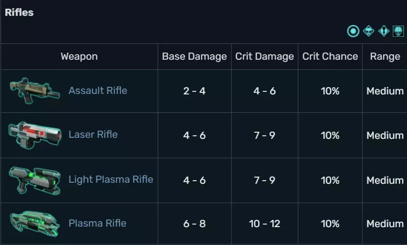 1. This is the main weapon of the solider. It shows how much ammo is spent and remaining. The specific weapon you are looking at is the LMG. 2. This is the secondary weapon of the soldier. For every other class except heavy it is a pistol instead of a rocket launcher. The Rocket launcher can only be used once unless the heavy has the ability to use it twice. Pistols also never have to be reloaded. 3. The icon to shoot, click it to bring up the hit chances and choose which enemy to shoot. 4. The icon for overwatch. This enables the soldier to take a shot at an enemy if they move in their line of sight for a small aim penalty. Certain soldier abilities can remove this aim penalty. 5. Reload icon, the only thing to note is that if you reload it will use both moves, but you can move and then reload to maximize moves. 6. Hunker down icon, any soldier can use hunker down except for MEC class. Hunker down doubles cover bonus and provides immunity to critical hits, but reduces sight radius. Only available while in cover (which should be all time because if your soldier is not cover....You clearly named that one after your ex or least favorite person). Disables the Close Combat Specialist ability of Assault class troopers. 7. Ability and traits icons, You will see penalties, bonuses, skills, and gene mods there. For this picture you only see the shredder skill icon. You can click on the icons to get a menu that explains what every current icon means and what the soldier current stats are (aim, will, etc.) 8. Class symbol, it is there to remind the people with short term memory loss that you brought (whatever class you brought). The symbol will change slightly if you genetically modified that soldier or if they have the psionic subclass. The example class symbol is for a heavy. 9. Really? No guesses as to what that is???? Wow...It is your soldier's name. 10. The soldiers current rank, the example is the corporal rank. 11. Pause menu button (Escape key also works) 12. End turn, its in the name you click you forfeit your turn simple. 13. Bring up a menu that explains what every current icon means and what the soldier current stats are (aim, will, etc.) 14. Switch between your soldiers (Yes I know mind blowing; you can also use the tab key). 15. Switch your camera angle (or use E and Q keys) 16. How much health points your soldiers have left (Major hint if you run out of point your soldier dies or could start bleeding out) 17. How much moves/actions you have left (you only get two). Some abilities can allow for you to shoot more than once or have your actions refunded. 18. How much cover your soldier is in. Full cover= full shield, Half cover= half shield, Flanked= shield turns yellow, No cover= blank shield with yellow outline. FYI, Blue is better chance at life, yellow is a crap I got outwitted by an alien, and empty is you either lost your cover due to a grenade or etc. or misclick (at least that better be the reason). 19. How many aliens your soldier sees (note just because you cannot see them does not mean they cannot see you) 20. Open the door, by acting more civilized, aliens will not be alerted and start running to your position. 21. That blue outline says your soldier can move there and will only lose one action point. 22. That yellow outline says your soldier can move there but you will use both action points (so be careful not to misclick) 23. This is an enemy within part, It shows whether or you got the meld, lost it, or that it is still out there. In this example they were able to collect both meld canisters. 24. That is just a opened meld canister so you can get an idea of what to look for. All weapons Soldiers carry a primary weapon, secondary weapon, and an item (two with Tactical Rigging in XCOM: Enemy Within). Primary weapons are a soldier's main source of firepower in combat; they include rifles, sniper rifles, shotguns, and LMGs. Secondary weapons vary; they include pistols, rocket launchers, and a wide range of tactical subsystems available to MEC Troopers that are installed directly to a MEC. On occasion a class ability (such as the Sniper's Headshot or a Heavy's Mayhem) is related to the weapon's technology level. These are, in order: Level 1: Conventional weapons (excluding the Rocket Launcher) Level 2: Beam weapons, Railgun EW, and Rocket Launcher Level 3: Plasma weapons, Alloy Cannon, and Particle Cannon EW Alright here we go here are the weapon stats.