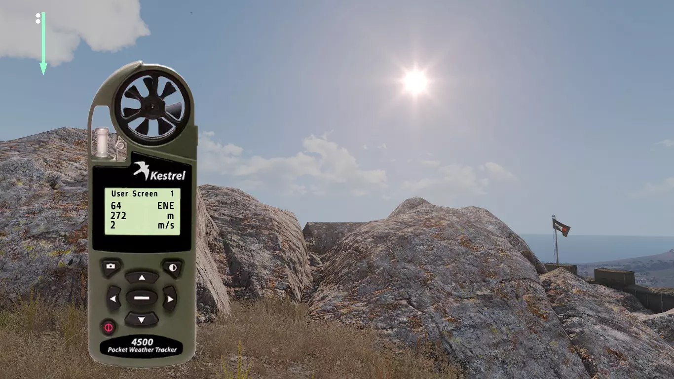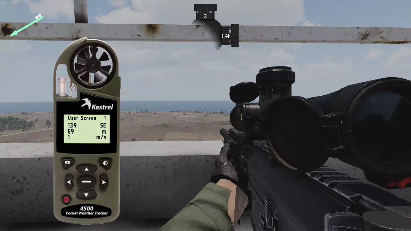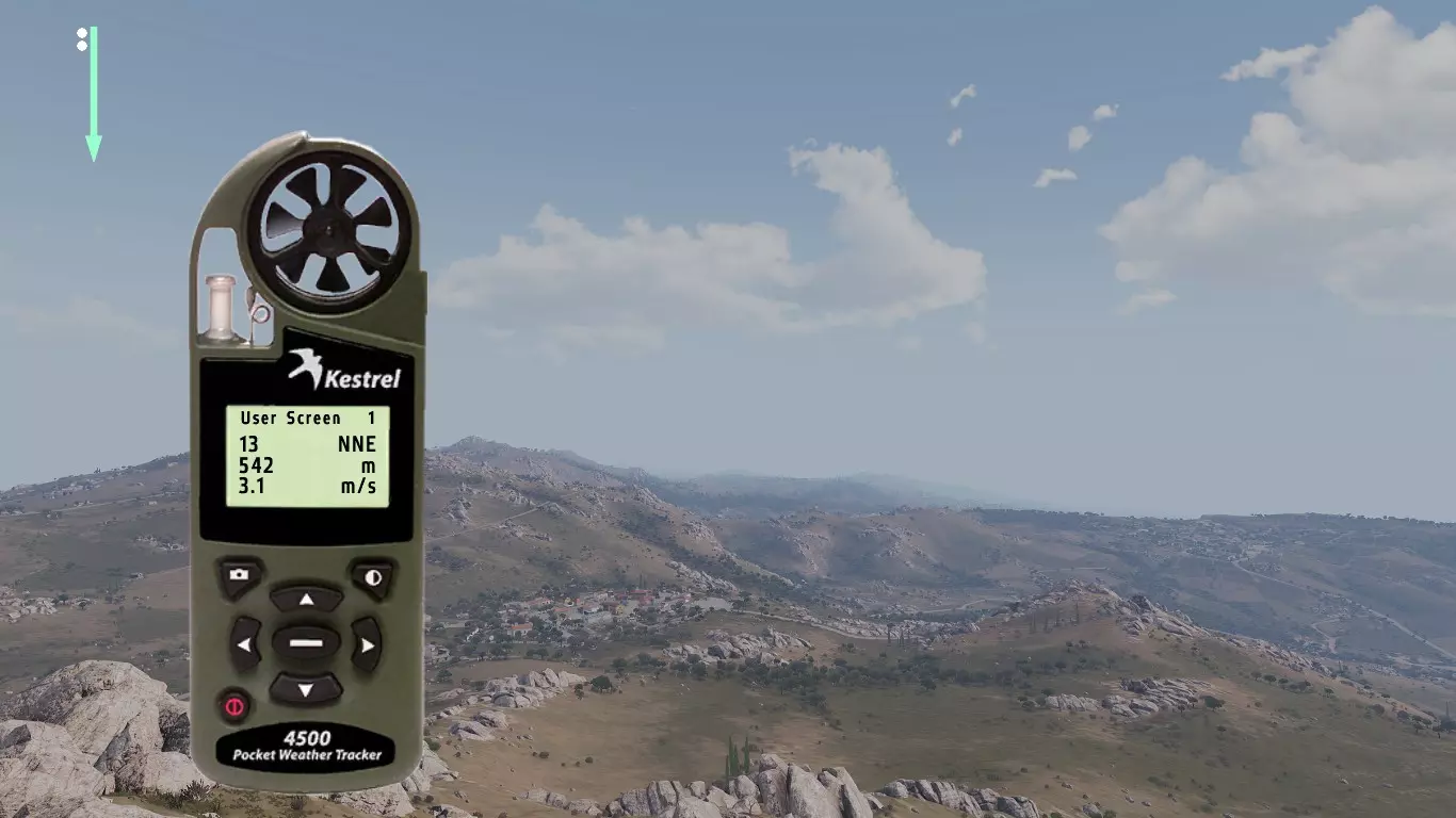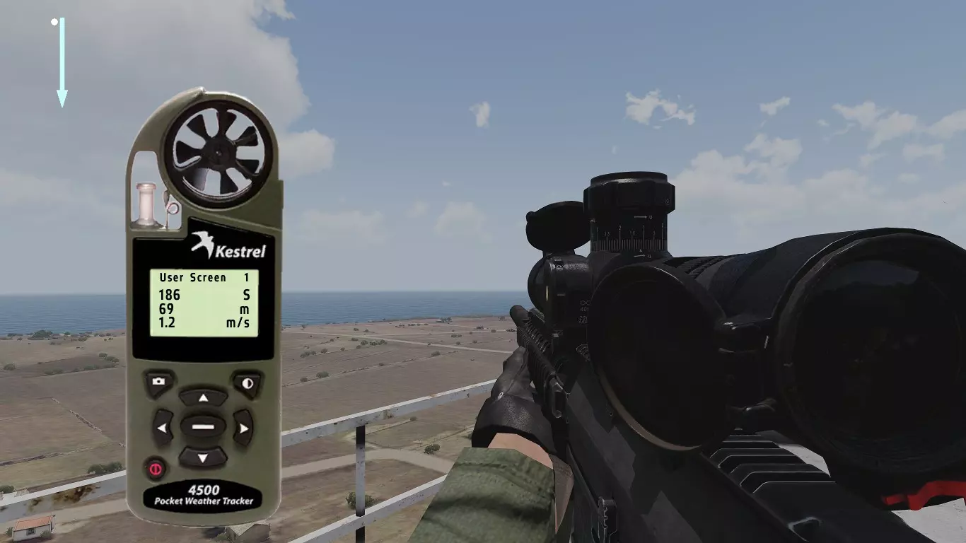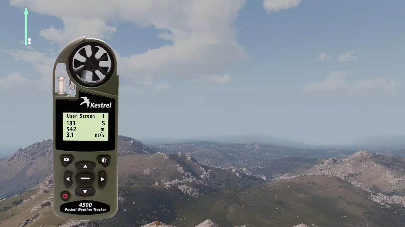 这是Mk11 Mod 0步枪的弹道卡,口径为.308。每种口径及其弹药类型都有各自的弹道表,包含不同的归零设置。 首先我们从距离开始讲起。如你所见,每50米和每5°C都有对应的归零设置。 进行目标归零时非常简单:获取距离,使用风速仪(Kestrel)查看温度,然后找到正确的归零值。 在较近距离时,50米间隔的归零设置已经足够接近;但如果要进行远距离对敌射击,就需要更高的精度,基本上要在两个设定的归零值之间找到特定距离对应的准确数值。这一点我稍后会详细说明。 距离归零之后,我们还会显示风速为4米/秒时的风偏归零设置。关于距离,这一点同样适用于风力。不过,游戏中不会为每5°C都设置一个归零值。因此,在较远的距离上,你需要自己根据每5°C的温差来调整归零。而在较近的距离,由于数值差异非常非常小,就无需调整归零了。 3.0 - 风力 根据我收集的信息和所有笔记,我将介绍游戏中的风力。 风力是《ACE3》中你会遇到的最不可预测的因素之一。 我知道在一开始就谈论这些基础内容可能有点奇怪,但为了让阅读本指南的玩家能够精通射击,你需要了解这类知识。 风力可以非常……有趣。这完全取决于风力的变化情况。有一种现象叫做侧风、逆风与顺风。 侧风是指吹向与行进方向交叉的风,在我们的场景中,就是会干扰子弹飞行路径(即弹道)的风。 我已将各个部分按顺序排列,这样你就能逐步了解它们是如何相互作用的。 我会尽力以最清晰的方式进行解释。 要理解风,你必须仔细观察它。 3.1 - Kestrel 4500NV Kestrel 4500NV是一个非常实用的工具,你可以用它来查看温度和风速,以及其他相关信息…… 再次强调,若要获取100%的完整风速,需打开Kestrel,站立时将其对准风吹来的方向,就能看到风速了。 在射击方面,使用Kestrel时你只需要关注两项数据。温度和风速(米/秒)显示在【用户屏幕1】和【用户屏幕2】上。 用户屏幕1:(米/秒)- 米每秒