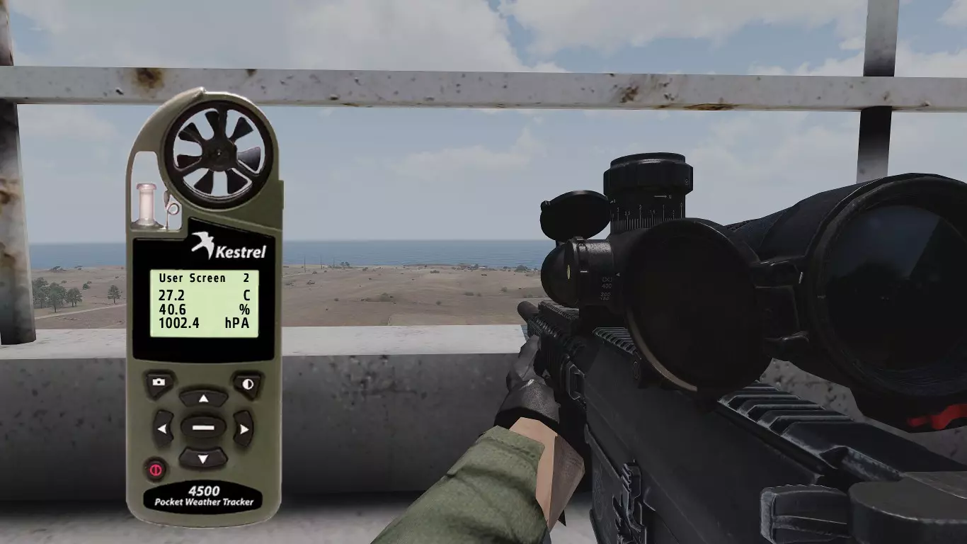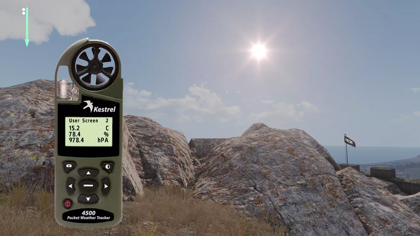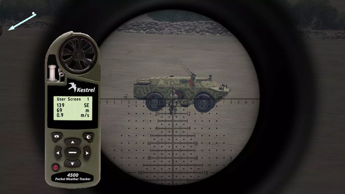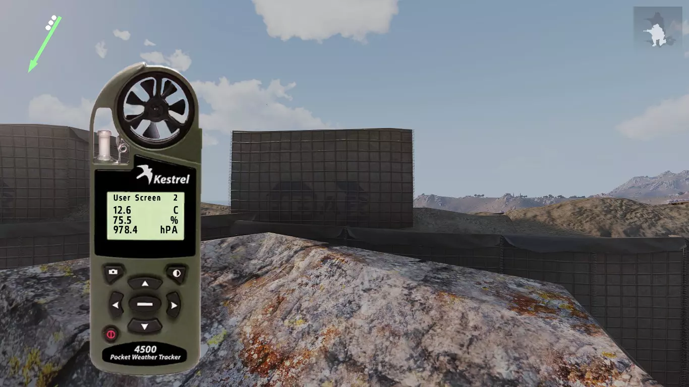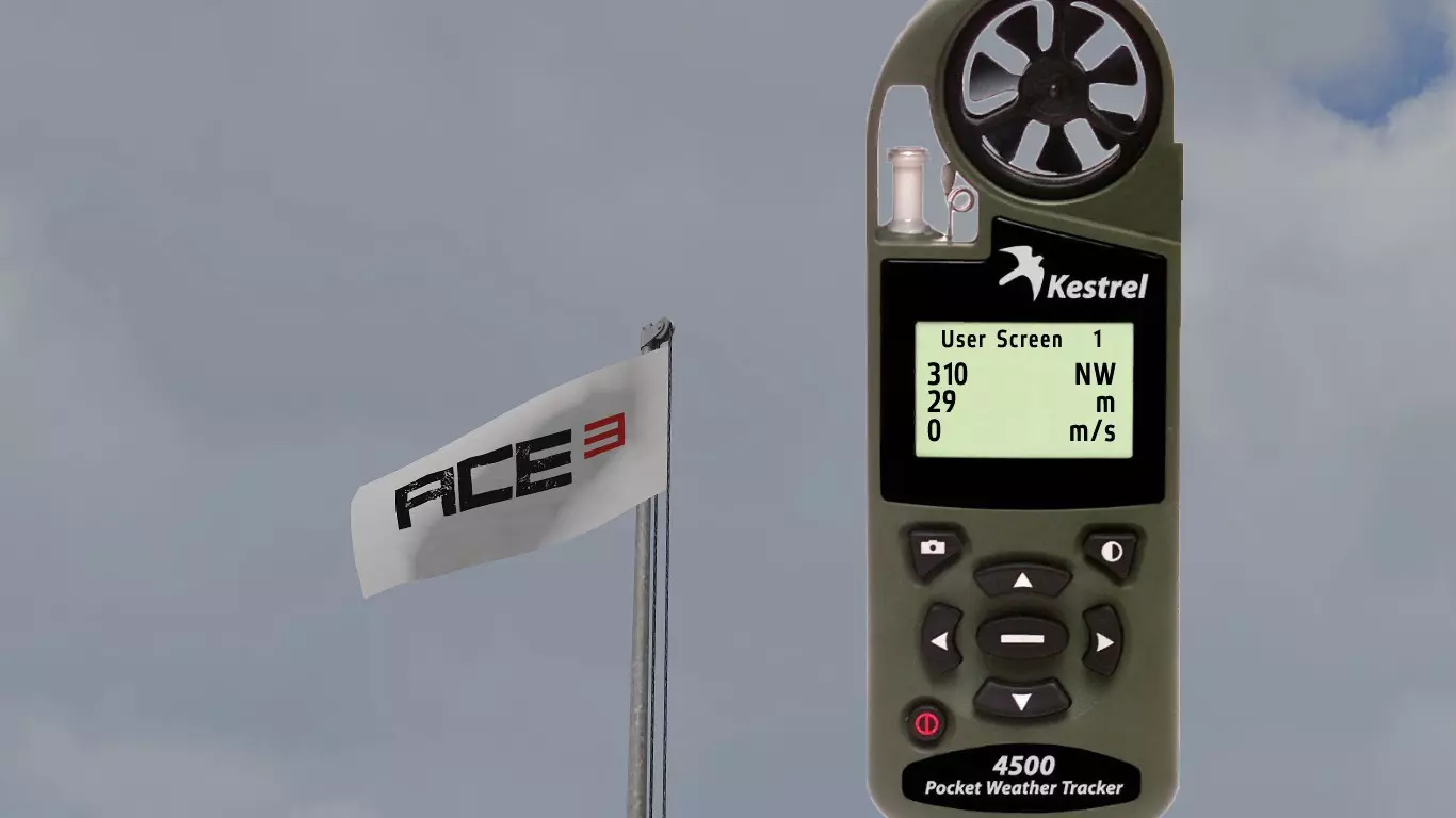这是Mk11 Mod 0步枪的弹道卡,口径为.308。每种口径及其弹药类型都有各自的弹道表,包含不同的归零设置。 首先我们从距离开始讲起。如你所见,每50米和每5°C都有对应的归零设置。 进行目标归零时非常简单:获取距离,使用风速仪(Kestrel)查看温度,然后找到正确的归零值。 在较近距离时,50米间隔的归零设置已经足够接近;但如果要进行远距离对敌射击,就需要更高的精度,基本上要在两个设定的归零值之间找到特定距离对应的准确数值。这一点我稍后会详细说明。 距离归零之后,我们还会显示风速为4米/秒时的风偏归零设置。关于距离,这一点同样适用于风力。不过,游戏中不会为每5°C都设置一个归零值。因此,在较远的距离上,你需要自己根据每5°C的温差来调整归零。而在较近的距离,由于数值差异非常非常小,就无需调整归零了。 3.0 - 风力 根据我收集的信息和所有笔记,我将介绍游戏中的风力。 风力是《ACE3》中你会遇到的最不可预测的因素之一。 我知道在一开始就谈论这些基础内容可能有点奇怪,但为了让阅读本指南的玩家能够精通射击,你需要了解这类知识。 风力可以非常……有趣。这完全取决于风力的变化情况。有一种现象叫做侧风、逆风与顺风。 侧风是指吹向与行进方向交叉的风,在我们的场景中,就是会干扰子弹飞行路径(即弹道)的风。 我已将各个部分按顺序排列,这样你就能逐步了解它们是如何相互作用的。 我会尽力以最清晰的方式进行解释。 要理解风,你必须仔细观察它。 3.1 - Kestrel 4500NV Kestrel 4500NV是一个非常实用的工具,你可以用它来查看温度和风速,以及其他相关信息…… 再次强调,若要获取100%的完整风速,需打开Kestrel,站立时将其对准风吹来的方向,就能看到风速了。 在射击方面,使用Kestrel时你只需要关注两项数据。温度和风速(米/秒)显示在【用户屏幕1】和【用户屏幕2】上。 用户屏幕1:(米/秒)- 米每秒