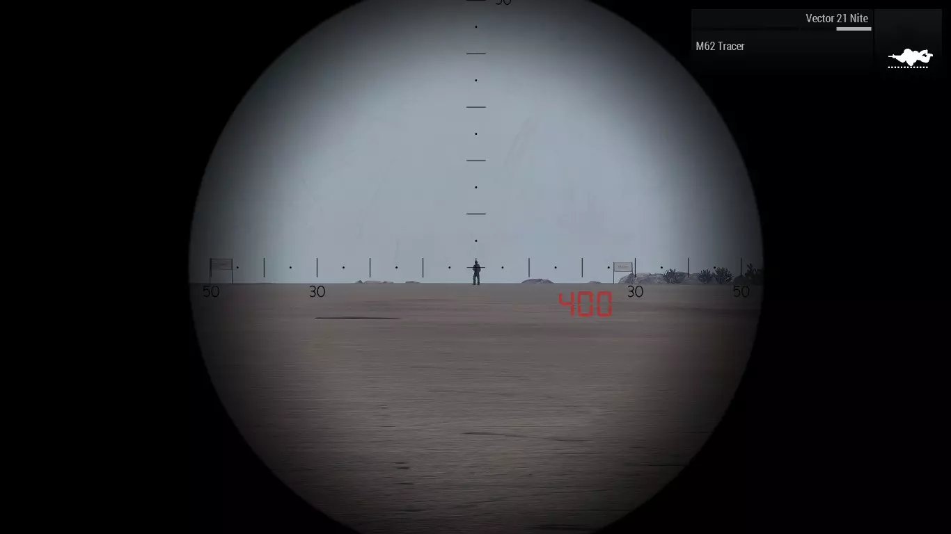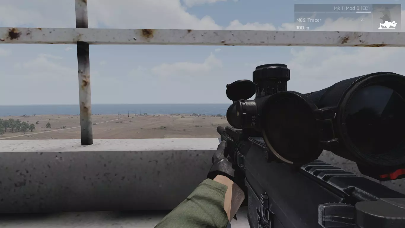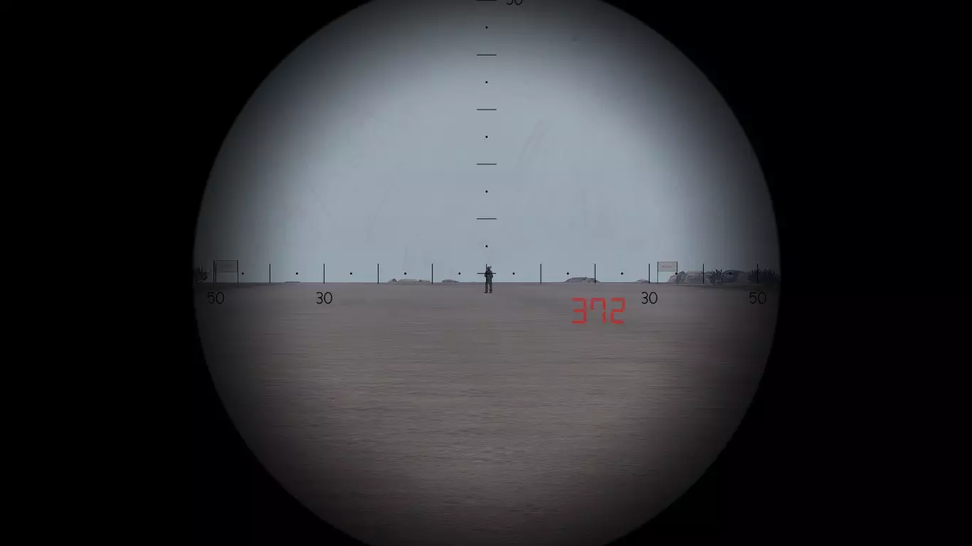 在第一张图片中,我们可以看到一个目标。由于不知道距离,我们需要随机应变。首先要做的是通过瞄准镜放大,在这个例子中,我使用的是RHSUSAF的Mk. 4 ER/T 6.5-20x M5瞄准镜。