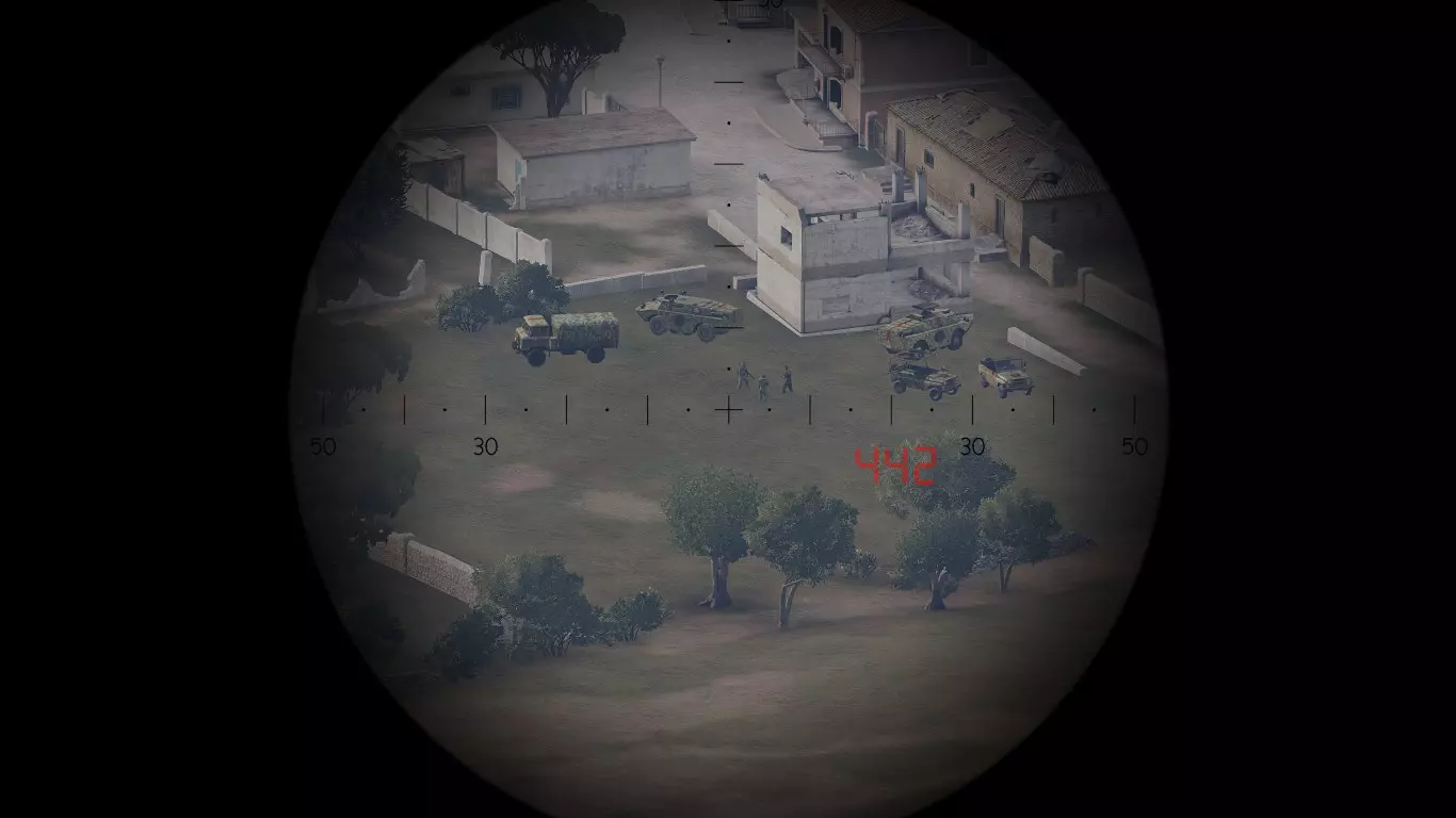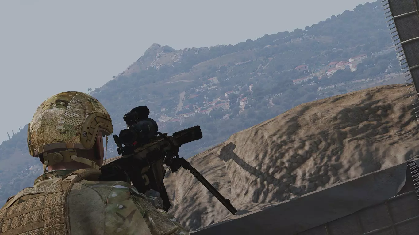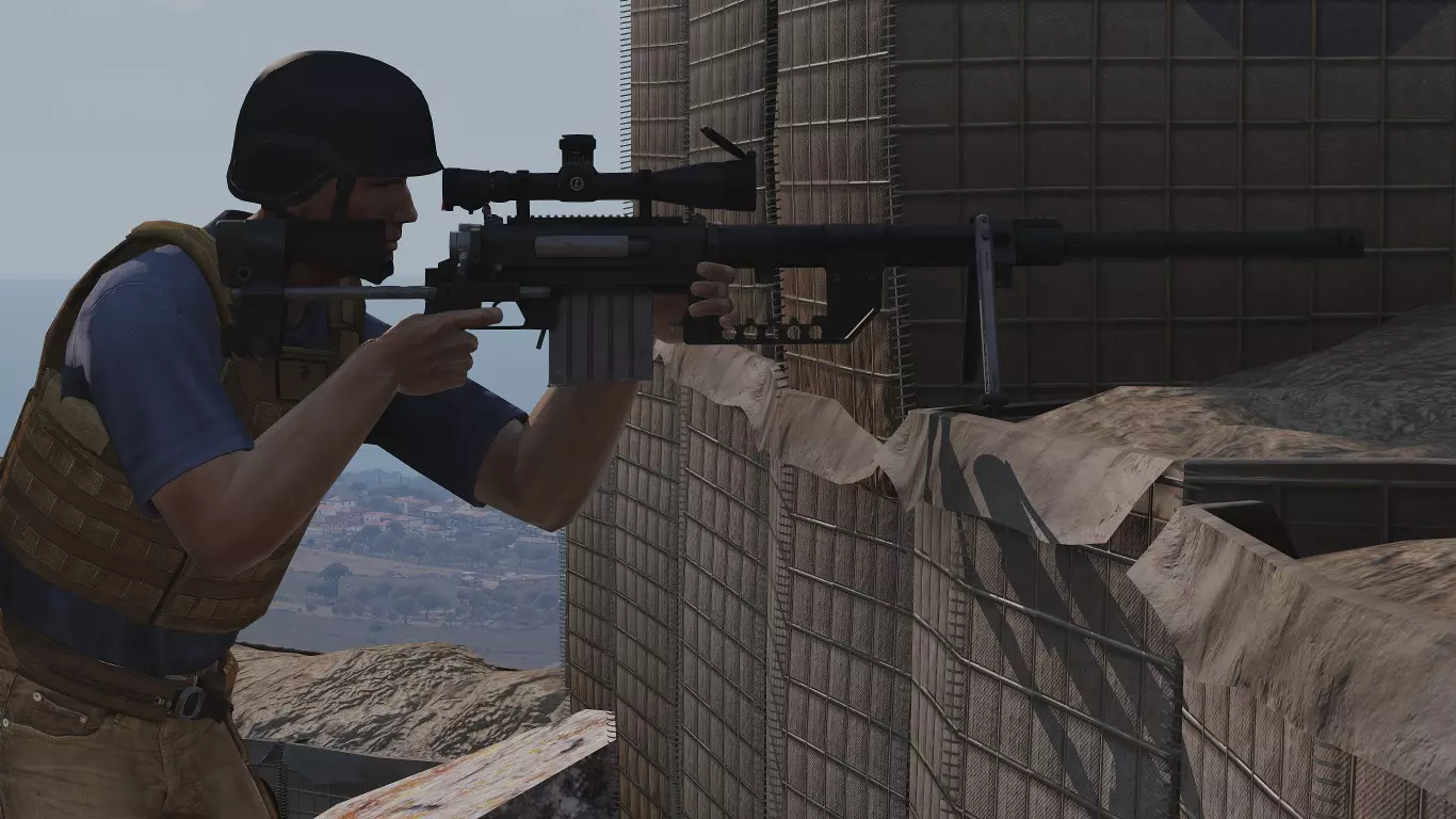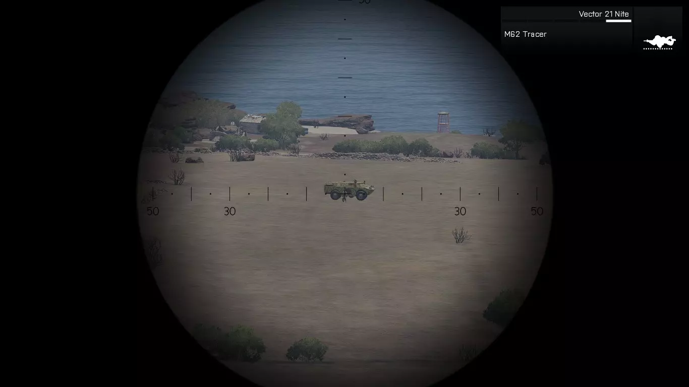 在第一张图片中,我们可以看到一个目标。由于不知道距离,我们需要随机应变。首先要做的是通过瞄准镜放大,在这个例子中,我使用的是RHSUSAF的Mk. 4 ER/T 6.5-20x M5瞄准镜。