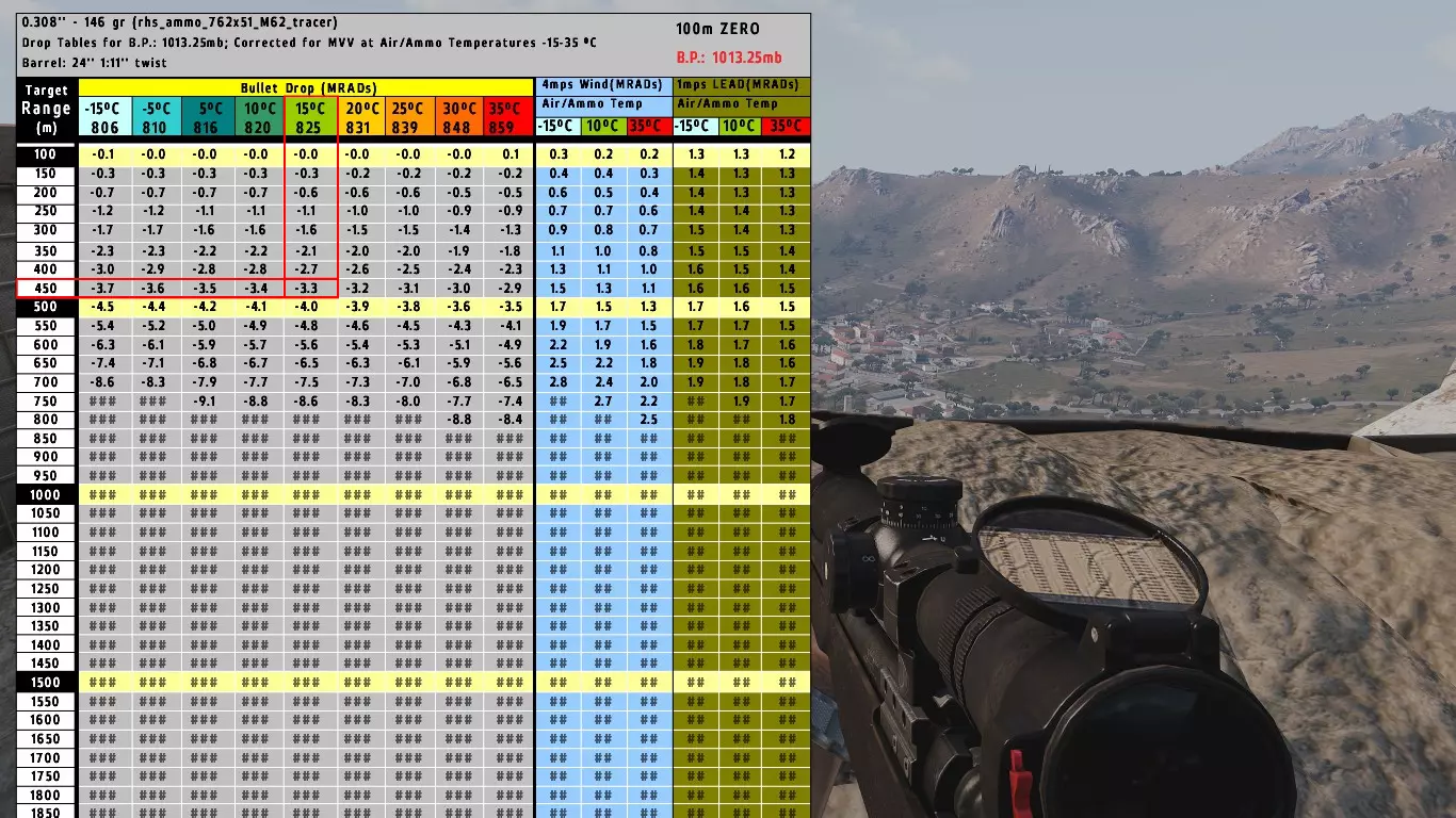 我们将使用与上述示例中相同的射表中的450米射程。