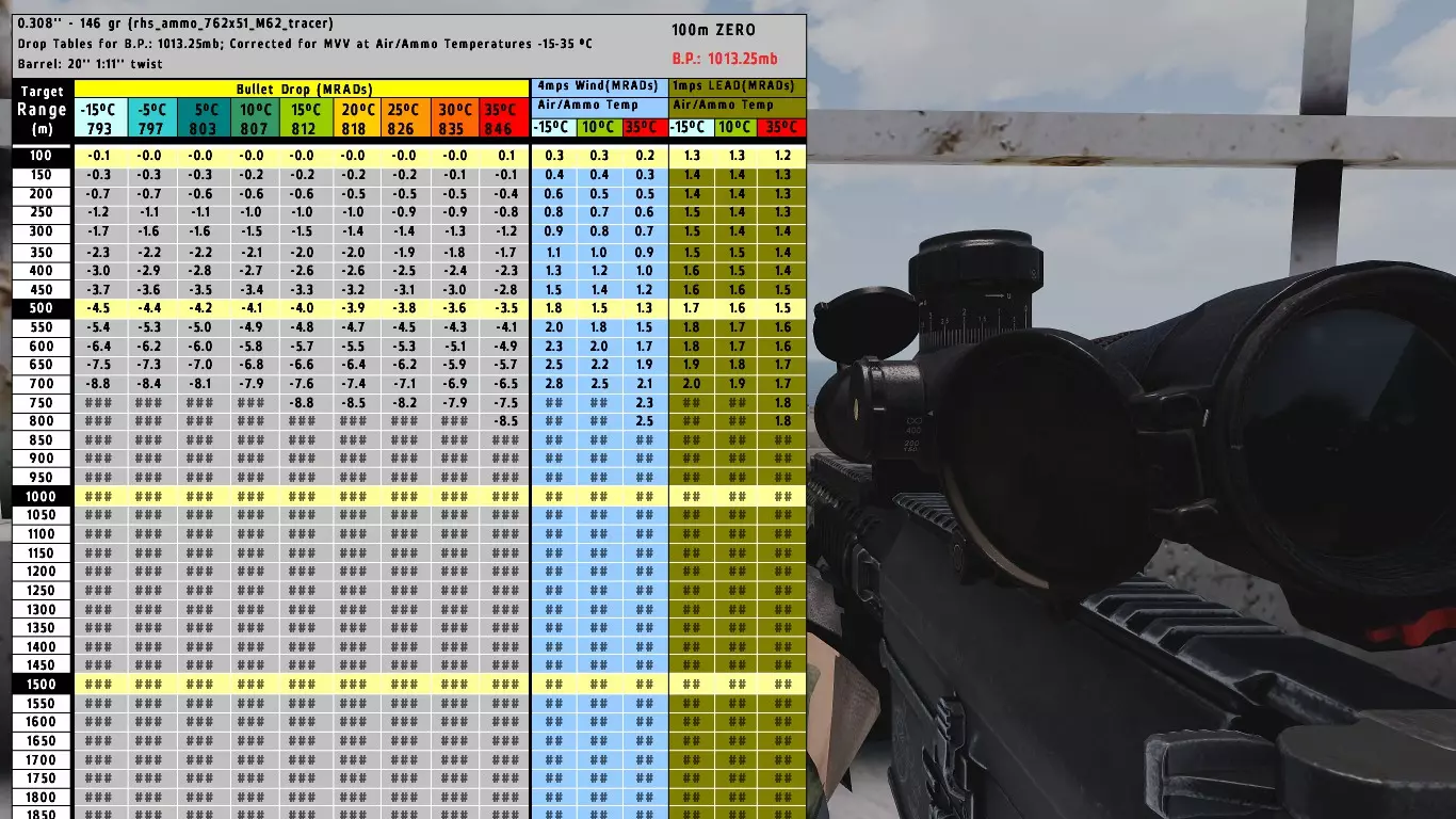 那么我为什么圈出3.2的归零值,而不是3.3呢?原因是我将归零值分成了5个部分。在射表上我们可以看到: 400米 - 2.7 450米 - 3.3 在战场上打破沉默前的平静时刻,你有机会尽可能精确地调整步枪归零。计算一下,3.3减2.7等于0.6。 所以在15°C的环境下,400米到450米之间的归零值间隔为50米。为了得到442米的归零值,我们将0.6的归零值分成5份。0.6除以5等于0.12,这样我们就把这50米分成了5部分,即10米对应0.12的归零值。 但这还没完。我们需要440米的归零值,所以要进行如下计算: 0.12乘以4等于0.48,取整后得到0。5,这就是我们要找的40米归零值。 400米+40米=2.7+0.5=3.2归零值。就是这样,搞定了。 对于较短的距离,你不需要这样的计算,因为没必要。在500米以内的距离,数值差异会小很多,但这取决于武器使用的口径。风的影响也是如此。 但是,如果你要在500/600-1000米左右与敌人交战,就必须进行这样的计算,否则你就是在浪费子弹。 瞄准镜设置控制: 【PgUp】用于增加归零值【距离】 【PgDn】用于减少归零值【距离】 【左Shift+PgUp/PgDn】用于以1.0为单位更大幅度地增加/减少归零值,而不是0.1、0.2、0.3这样的小幅度调整。【射程】 现在,我们从风开始讲起。 要进行风力归零,我们必须获取温度、射程和风速。