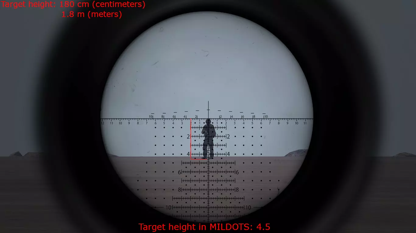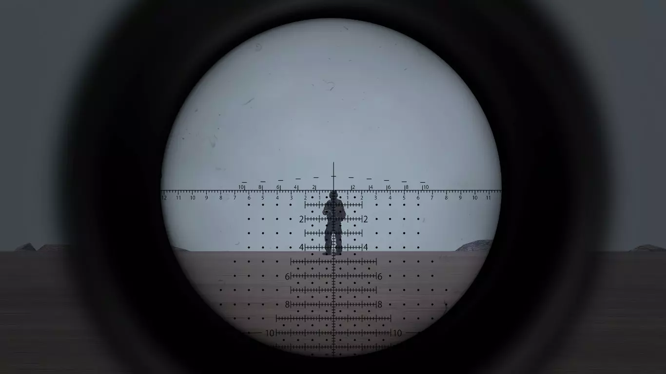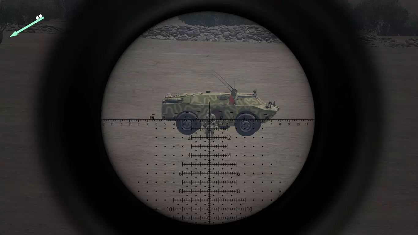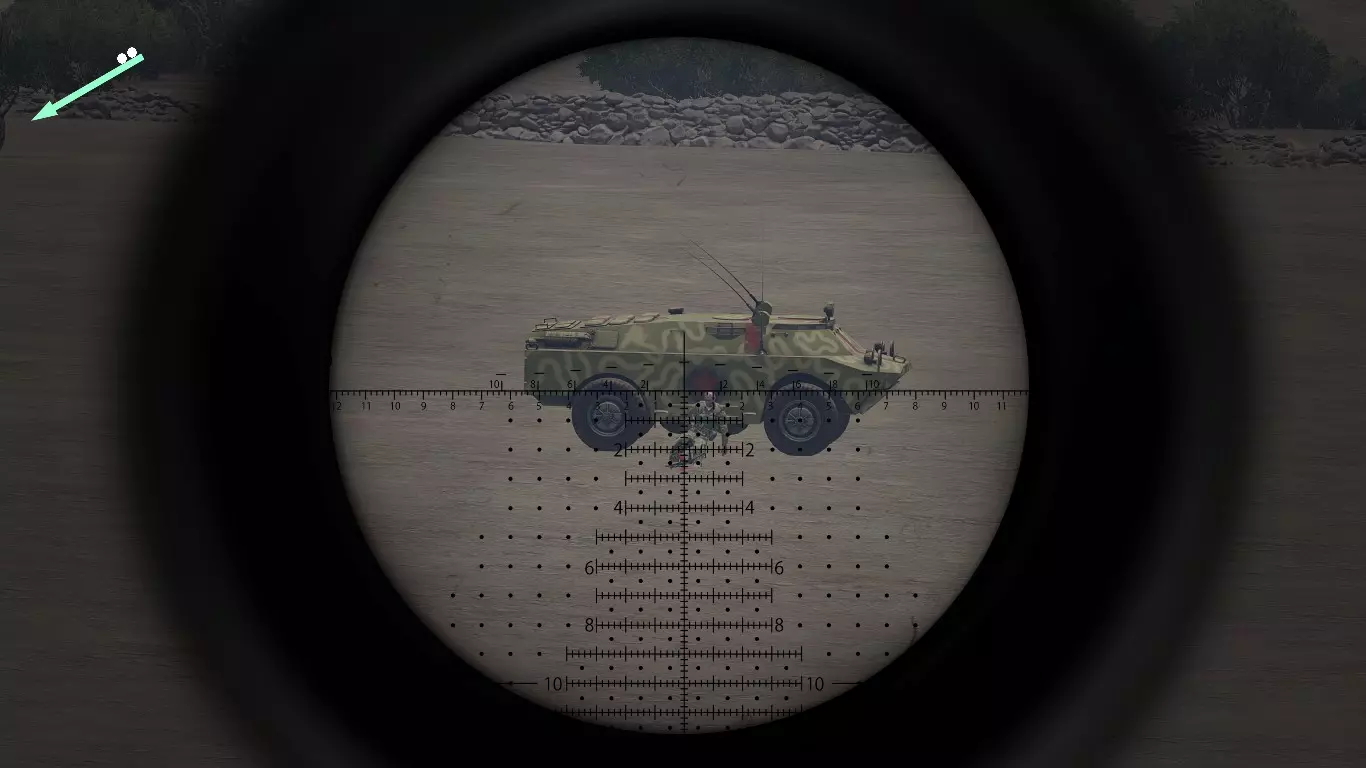 2.1.0 - 狙击镜与观察镜【密位点】 使用密位点是估算目标距离的一种非常有效的方法。 这很简单,具体取决于你使用的瞄准镜。 放大倍率为20倍的瞄准镜非常适合估算到目标的距离。 ACE3或RHS模组提供的观察镜也非常适合这项工作。 如果你想了解更多关于放大倍率和密位点的信息,可以自行进行一些研究。 不要忘记将步枪靠在物体上或将两脚架放在地面或物体上,这样可以减少枪支晃动。