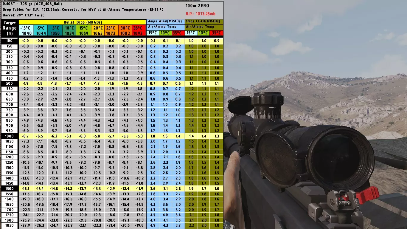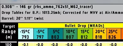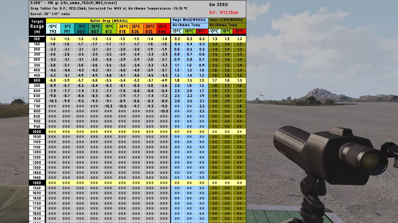 我们已获取以下数据: 射程:450米 温度:15°C 风速:2米/秒 风速表分为3个温度列:-15°C、10°C、35°C。 出于我们的目的,我们将使用10°C列,因为15°C更接近该温度,而非其他温度。 因此,在450米处风速为4米/秒时的归零值设为1.3。 为了得到1米/秒风速的归零值,我们必须将当前归零值分为4份。 1.3 ÷ 4 = 0.325 0.325就是我们1米/秒风速的归零值。现在我们可以进行实际计算了。我们将此归零值乘以我们获取的实际风速,即: 0.325 × 2 = 0.65 0.65的归零值必须分为10份。 0.65 ÷ 10 = 0.065