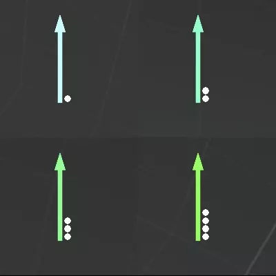 在上图中,你可以看到4个箭头。每个箭头都带有一组点。第一个箭头有1个点,第二个有2个,第三个有3个,第四个有4个,这种规律可以继续延续下去。我最多达到过8个点。箭头右侧的点越多,箭头的颜色就会发生变化。颜色和点的数量共同显示风速。
