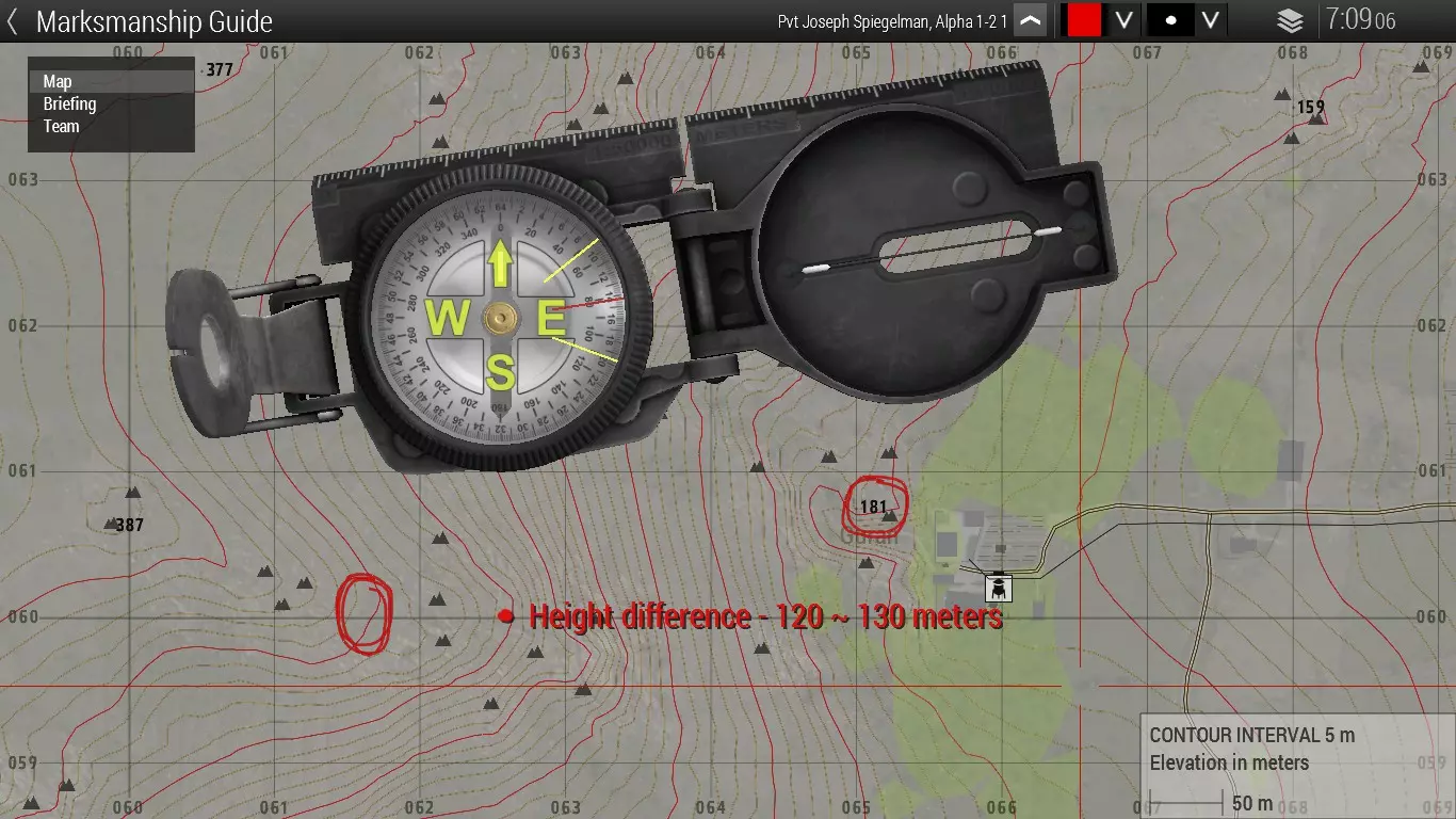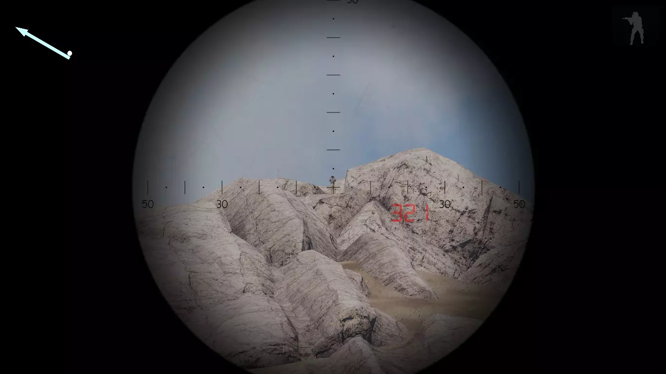 在上述图片示例中,我们可以看到屏幕左上角显示的风向箭头从两个视角呈现出不同的信息,这表明你方显示的信息与敌方所在位置的信息并不相同。最后,我们可以看到高度差约为120至130米。 在这些情况下,子弹的弹道永远不可能完美,但尽可能让弹道更精准以接近目标是你的目标。后续章节将详细介绍相关内容!