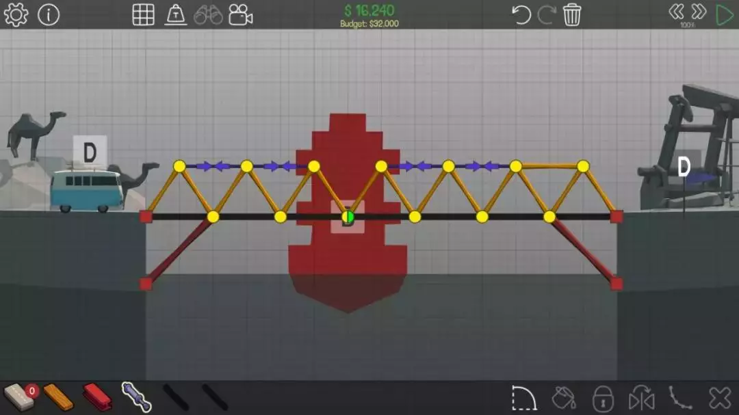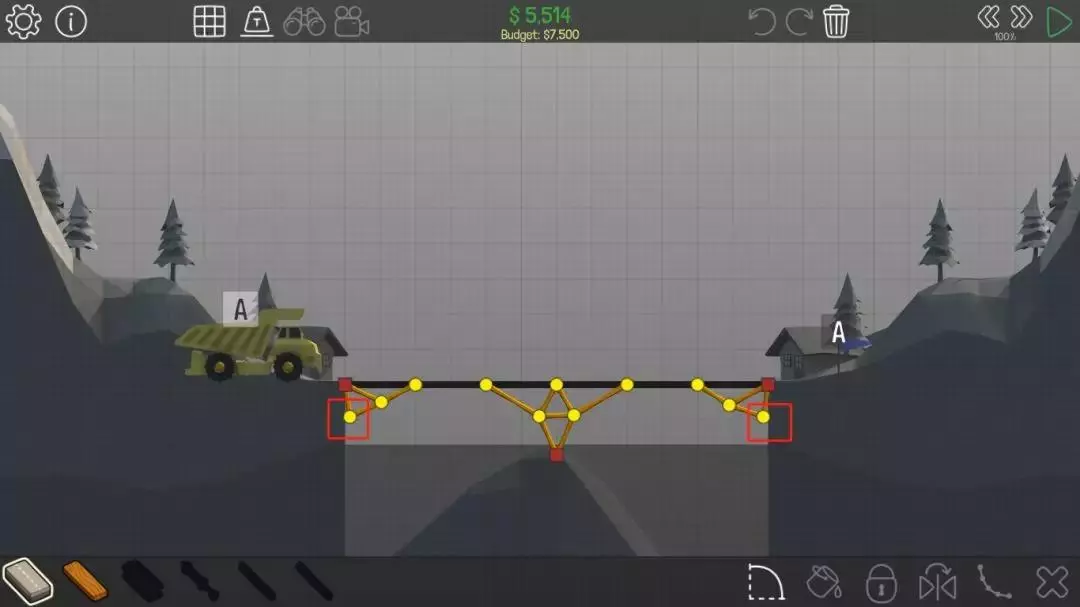 不要使用液压装置,建造一座如下图所示的桥,直接选择地面作为受力点,尽管这里没有红色的固定节点。
