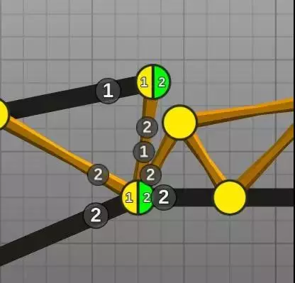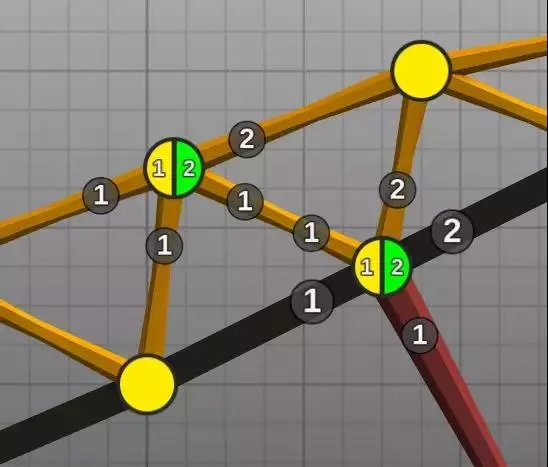 分离点局部放大图如下,数字与相连的杆件相关。数字相同的杆件在分离时会捆绑在一起,数字不同的则会相互错开。