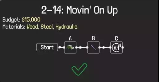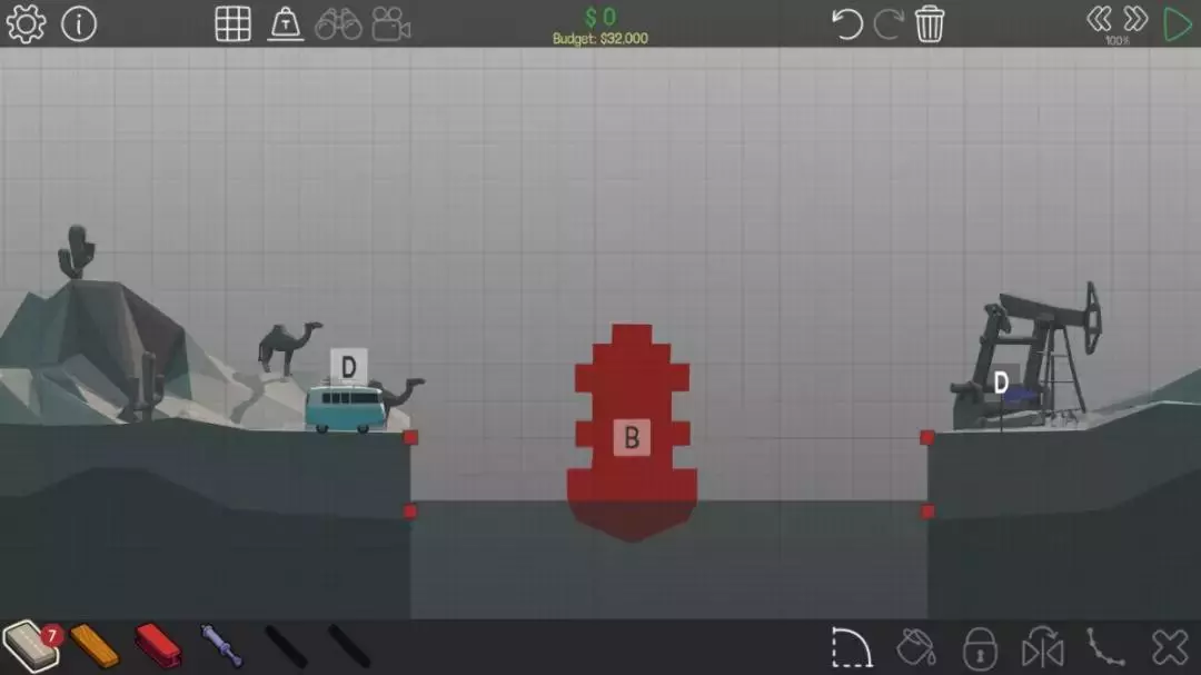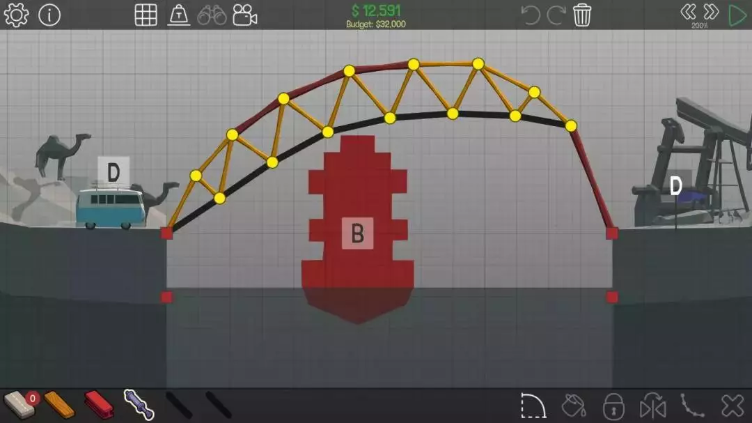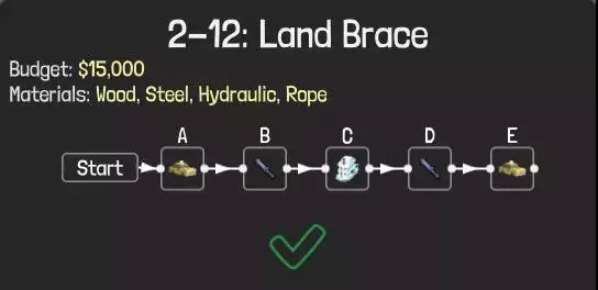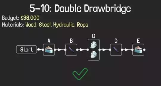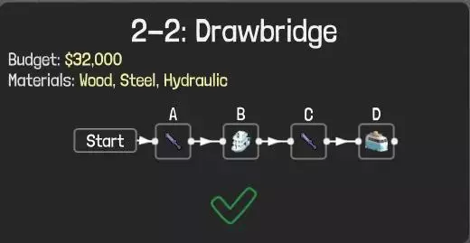 虽然是一次性桥梁,但能过关,而且造价很低适合冲击排行榜。不过一次性桥梁无法达成全部成就,成就党可以直接加固各个构件,确保所有构件不会损坏。 方法3:液压 (3)能不用液压的地方最好别用,毕竟从前面的价格表也能看到,液压确实很贵。以2-2关卡为例,按流程应先启动一次液压装置,让B船航行,接着再次启动液压装置,最后让D车行驶以获取小旗。该关卡跨度为14米,且桥面数量有限制,仅能使用7片。